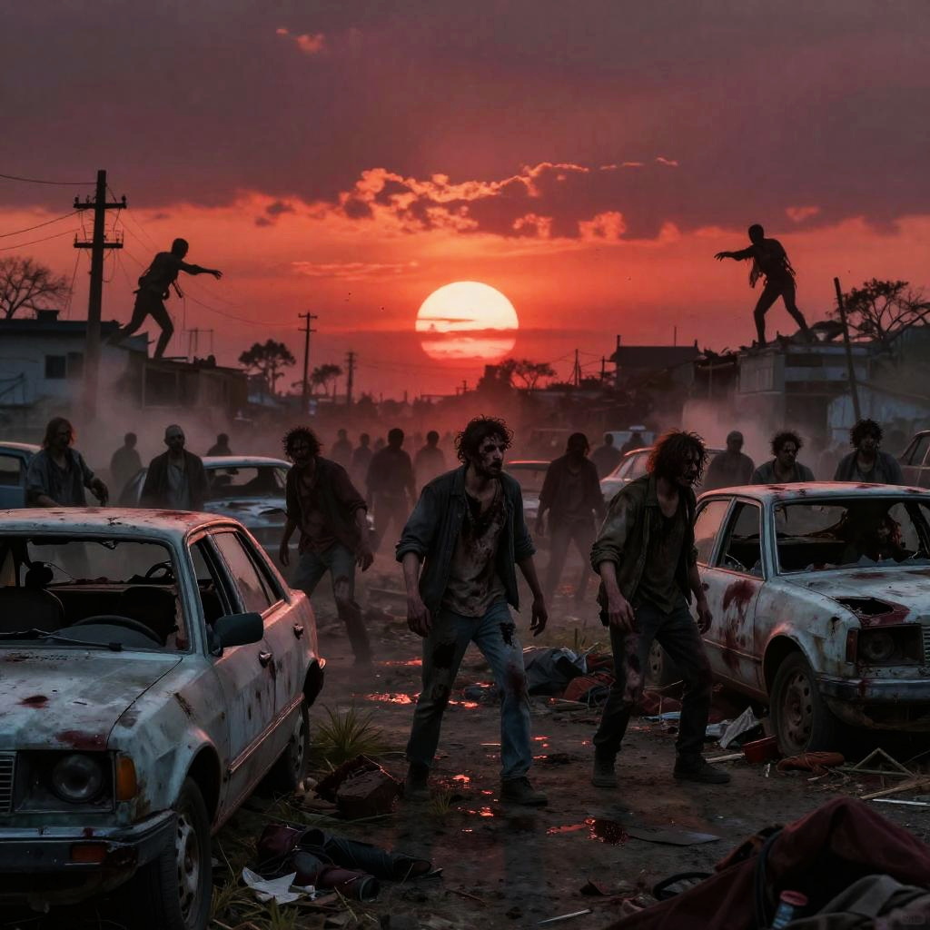 Survivors in a zombie apocalypse generated landscape, with ruined vehicles, twisted metal, and ragged remnants of humanity fighting off waves of undead, under a blood-red sunset sky, gritty and suspenseful atmosphere, highly detailed illustration.