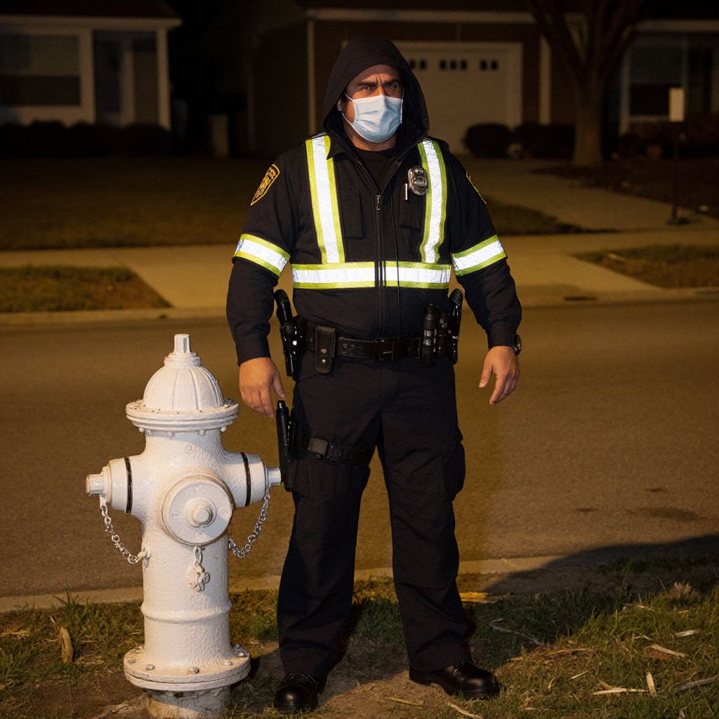 A nighttime scene photograph of an officer in a full officer pat down costume, patrolling a quiet suburban neighborhood, standing next to a fire hydrant, the costume has reflective elements and a hood slightly pulled over the shoulders, the officer has a rugged facial structure, broad forehead, and dark brows, wearing a practical face mask under the hood, realistic shadows and ambient street light casting deep silhouettes.