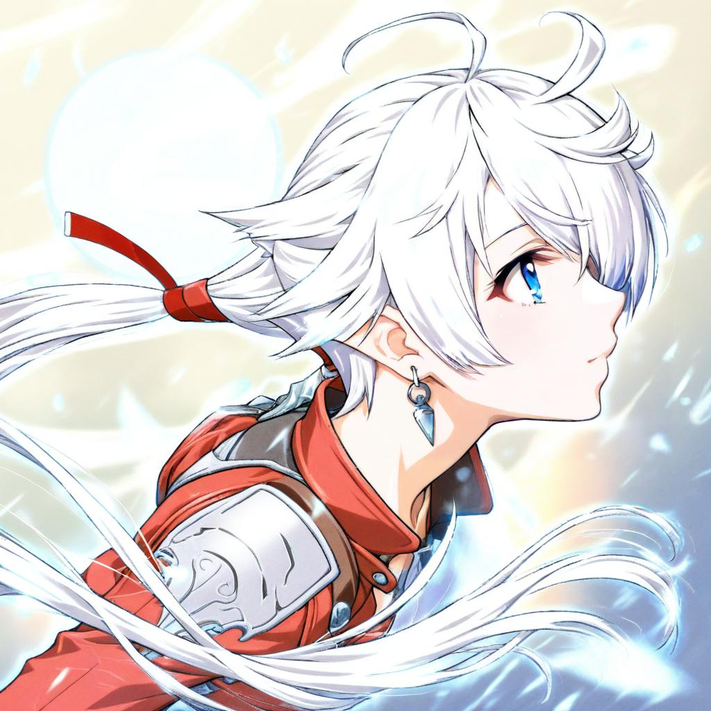 Alisaie leveilleur, final fantasy, 1girl, blue eyes, hair over one eye, white hair, long hair, ahoge, ponytail, hair ribbon, red jacket, earrings, elezen, by artist oosaka kanagawa, animagine