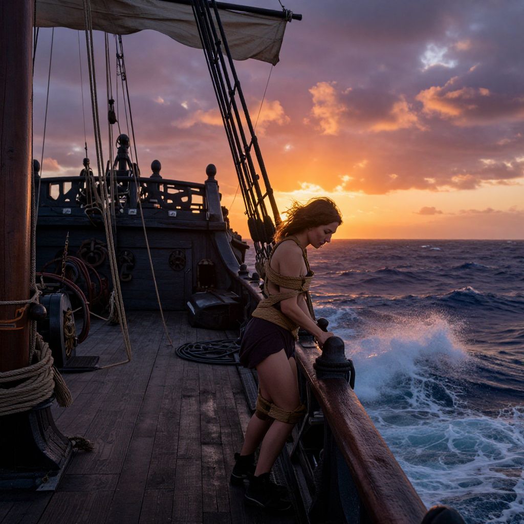 Hogtied woman on the deck of a pirate ship at sunset, ocean waves crashing around, dramatic orange and purple sky, rugged wooden textures and intricate knots, a scene blending adventure and peril