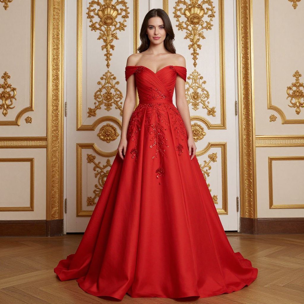 Photograph of a young woman standing in an ornately decorated room with gold-accented white walls. She has long, wavy dark brown hair and wears an off-the-shoulder, vibrant red ball gown with intricate floral embroidery on the skirt. The gown has a fitted bodice and a full, flowing skirt that pools slightly on the wooden floor. The room's background features detailed gold molding and paneling. The woman's makeup is elegant, with a focus on her eyes, and she holds her right hand gently at her side while her left arm rests by her side. She exudes a classic, regal beauty.