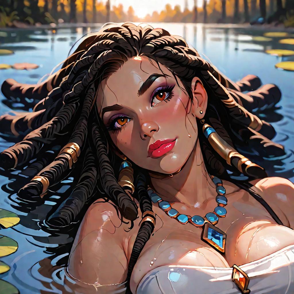 Score_9, score_8_up, score_7_up, , source_real, raw, photo, amateur, woman, Diamond Face, Asian Eyes, eye colors Grey, long nose, protruding lower lip, high cheekbones, round chin, titian, dreadlocks, grey, primer, __15JeweleryMaterials__ __14Necklace__, Large and round breasts, :o, lying in a river, wet, sunny, nature, soft light, lens flare, highly detailed, detailed skin, depth of field, film grain