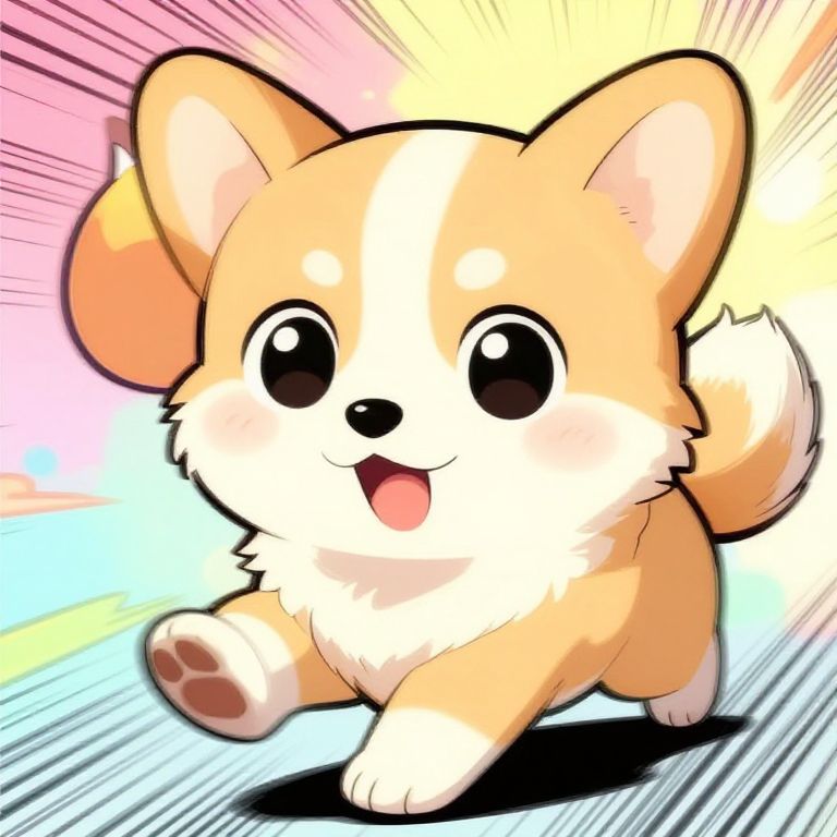 This is a digital drawing in a cute, anime-style featuring a chubby, orange and white puppy with large, expressive black eyes and a joyful expression. The puppy has a small black nose, a pink tongue hanging out, and its tail is curled upwards. Its ears are large and floppy. The background is a colorful, dynamic gradient with pink, yellow, and blue hues, and speed lines radiating from behind the puppy, giving a sense of movement and excitement. The puppy's paws are pink on the bottom, and it is depicted mid-leap, adding to the playful and energetic feel of the image.