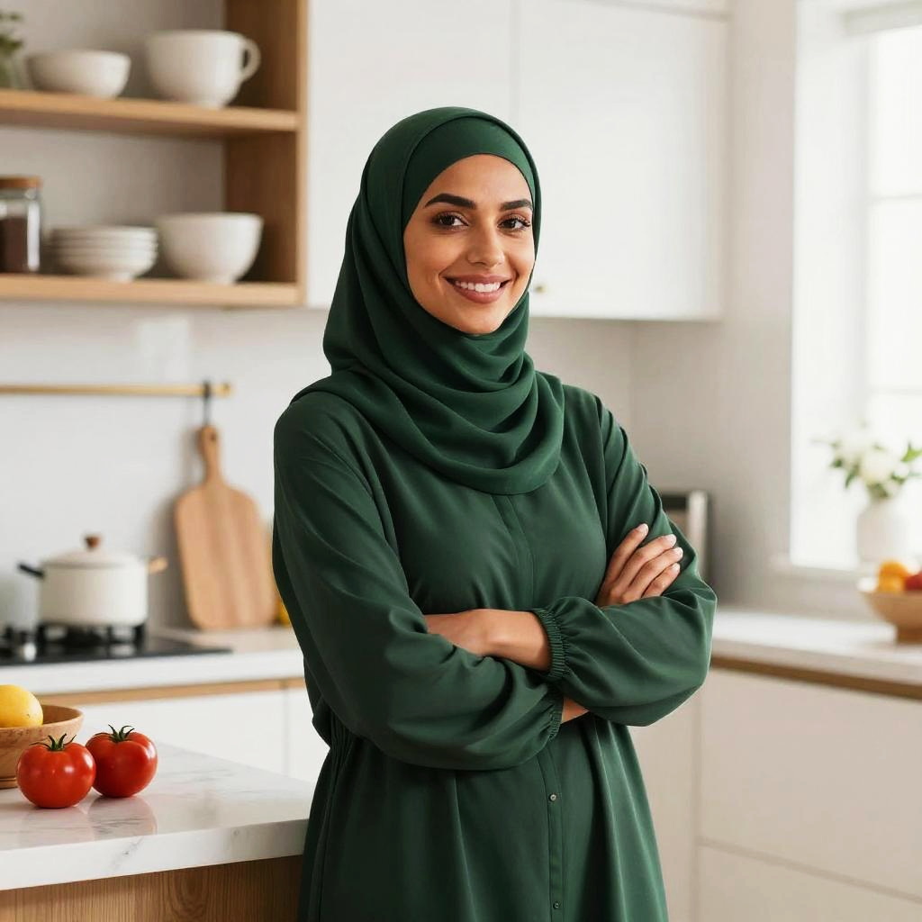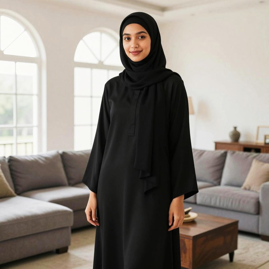Photograph of a young woman standing in a bright living room. She's wearing a long, black, traditional dress with a matching hijab and a black scarf draped over her shoulders. She has a light brown complexion, dark eyes, and a slight smile. The room features large arched windows, a gray sectional sofa, and an ottoman, with natural light filling the space.