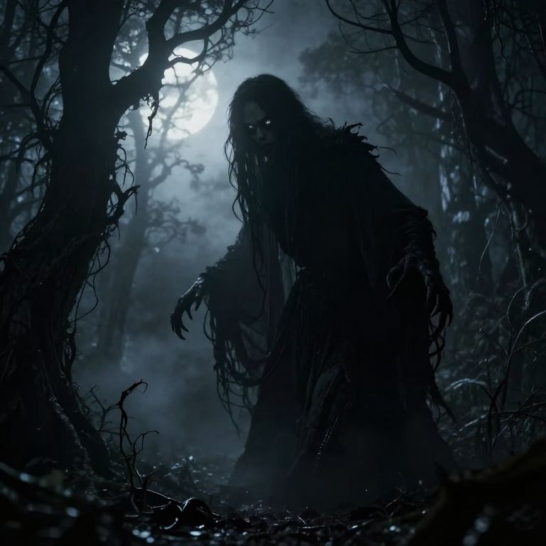 Digital artwork of a shadowy, ghostly figure with long, tattered hair and glowing eyes, emerging from a dark, misty forest under a