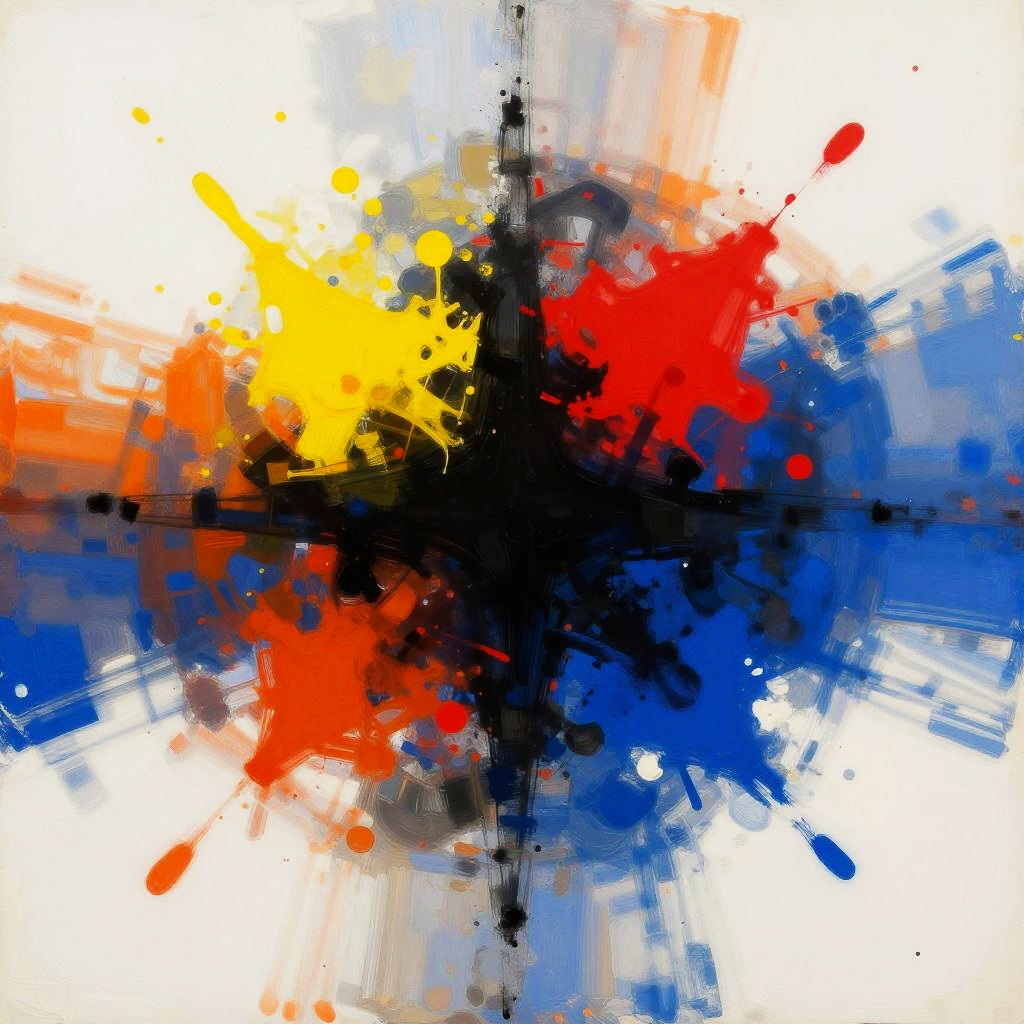 This image is a digital abstract painting featuring bold, blurred colors. At the center, there's a black, abstract shape with red and yellow splashes surrounding it. The background is a mix of white, blue, and orange hues, creating a vibrant, dynamic feel. The overall style is modern and expressive, with a focus on bright, contrasting colors.