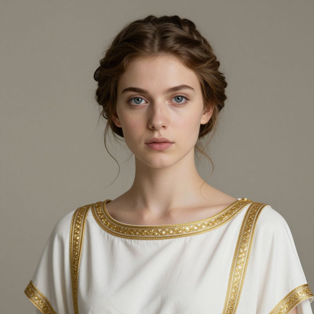 A young woman with blue eyes and an ancient Greek hairstyle, wearing a white tunic with gold borders.