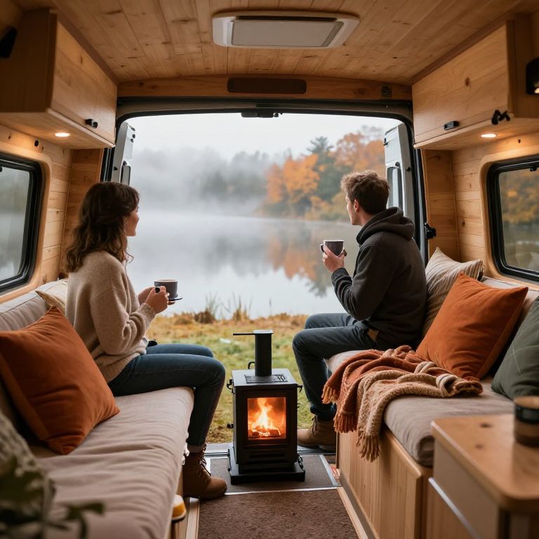 Cozycampers inside a rustic camper van with wooden interiors, soft colorful pillows and warm blankets, a small indoor fireplace casting a gentle glow, outside a misty lake reflecting autumn foliage, a couple enjoying hot drinks, a serene and intimate camping scene.