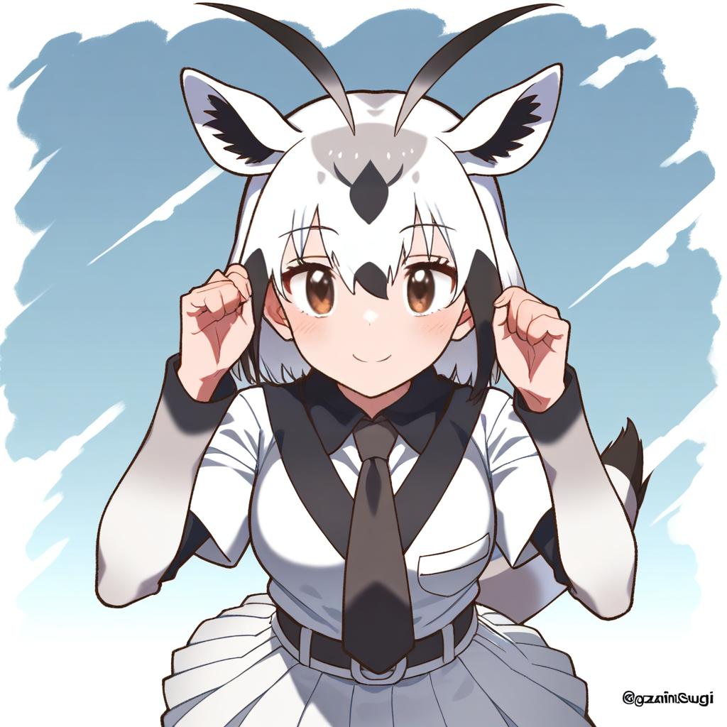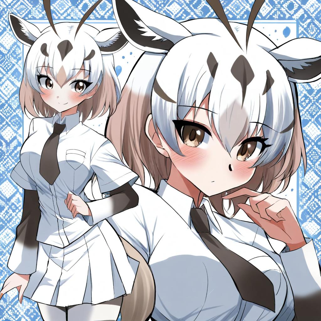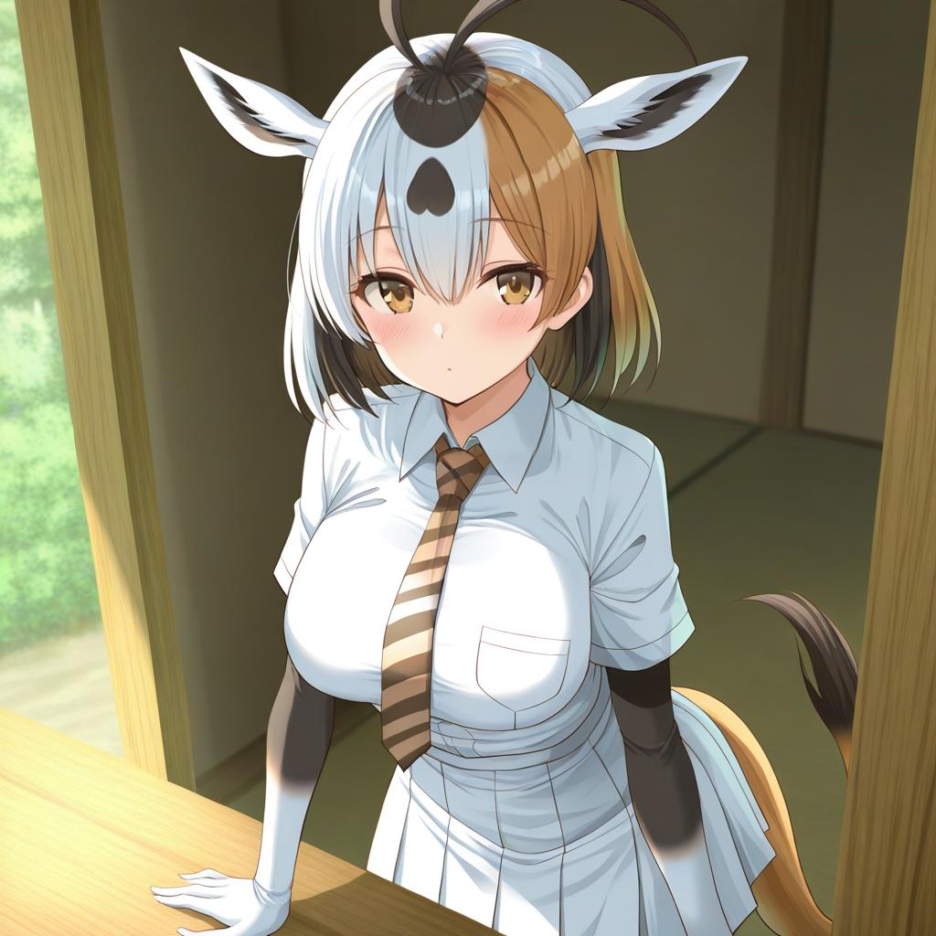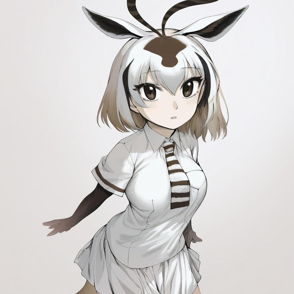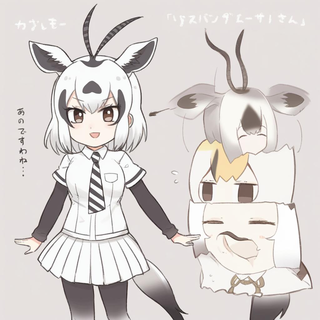 Arabian oryx (kemono friends), kemono friends, 1girl, gazelle ears, gazelle tail, tail, extra ears, gazelle horns, brown eyes, hair between eyes, white hair, short hair, two-tone hair, antenna hair, brown hair, black hair, pleated skirt, white skirt, white shirt, collared shirt, striped necktie, short over long sleeves, by artist mitsurugi sugar, animagine