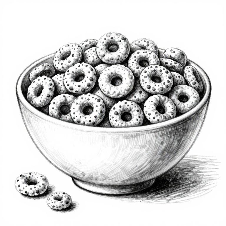 The image is a black and white sketch of a cereal bowl filled with a variety of cereal pieces. The bowl itself is detailed with a textured surface, giving it a realistic appearance. Inside the bowl, there are several types of cereal pieces, including circular shapes with a hole in the center, resembling Uzumaki-style donuts, and smaller, round pieces with a dotted pattern. The bowl is placed on a flat surface, and there is a small puddle of cereal at the base, suggesting that some cereal has spilled out. The overall composition is balanced, with the bowl centrally positioned and the cereal pieces arranged in a somewhat random yet visually appealing manner. The sketch style is intricate, with fine lines and shading that enhance the texture and depth of the objects.