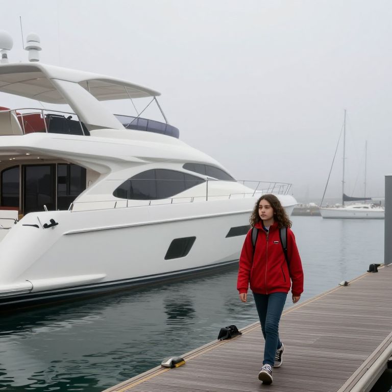 A modern glass-and-steel yacht dock at a marina in a foggy harbor, soft gray tones, a teenage girl with curly brown hair and a red jacket walking along the dock with a backpack, her face half-lit by the foggy light, with distant sailboats and gentle waves.