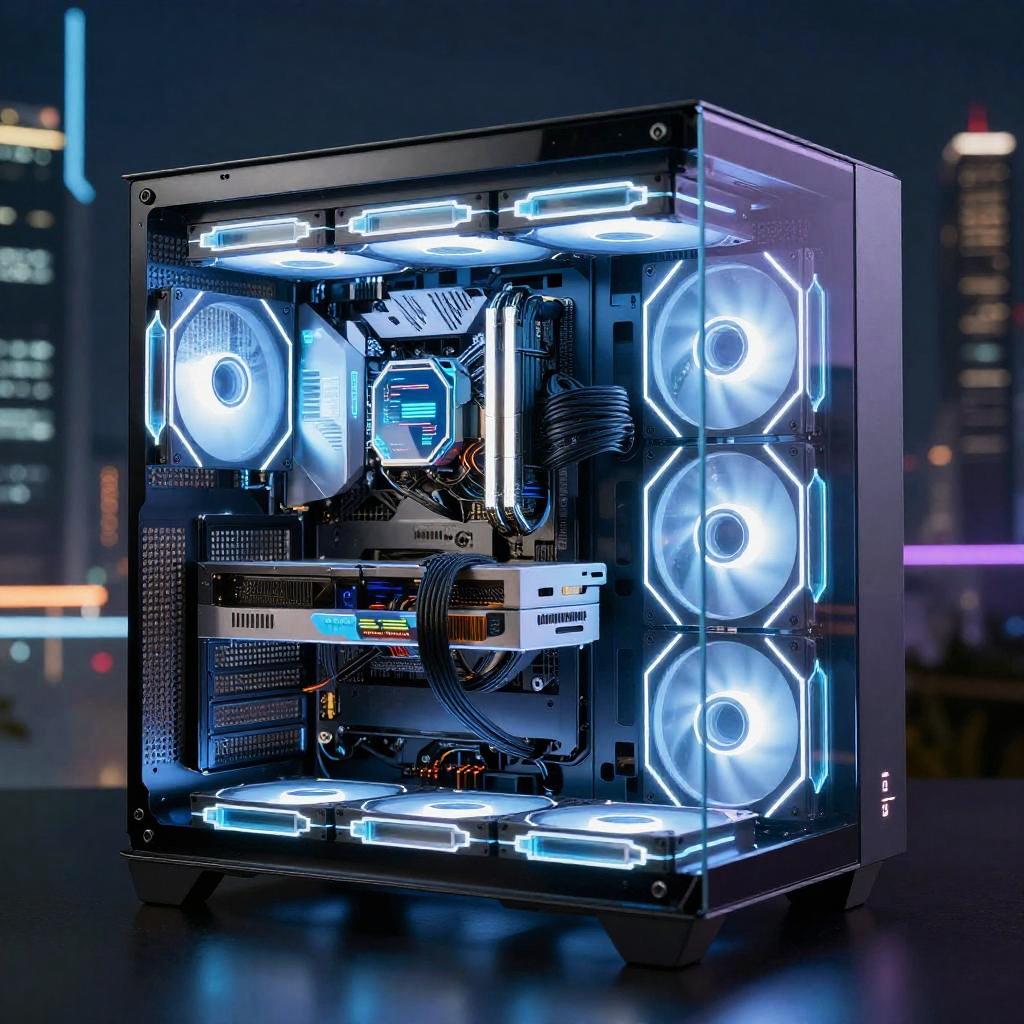 Futuristic PC with sleek transparent chassis, neon blue lighting, advanced cooling system, floating holographic display, cyberpunk cityscape background, ultra-high tech design