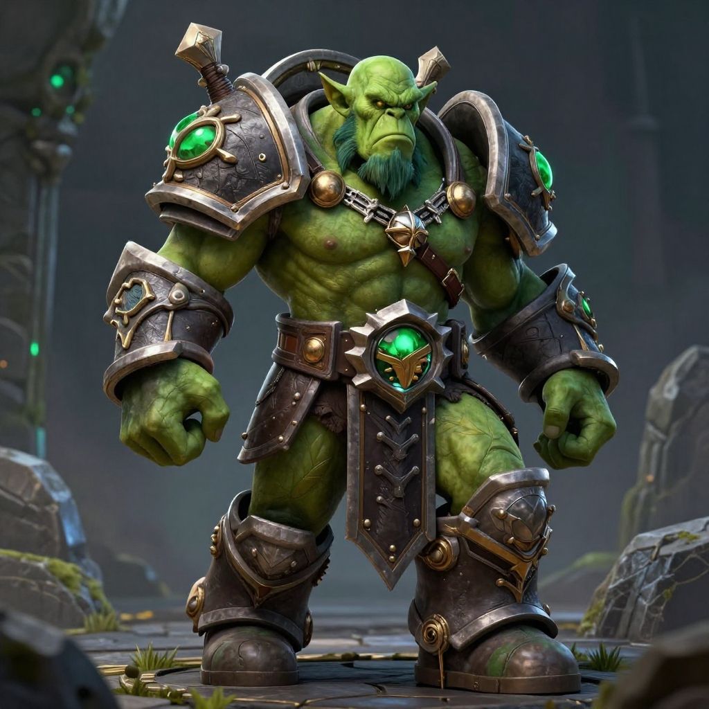 A detailed CGI image of a muscular, green frog-man with bright orange, glowing eyes standing in a fantasy environment. He wears ornate, metallic shoulder armor with intricate designs, a leather belt with a star-shaped buckle, and matching arm bracers. His skin is textured with small green scales, and he has a prominent, smooth yellow chest. The background features a dimly lit, cavernous setting with glowing, amber light beams and other fantasy creatures in the shadows. The image has a vibrant, high-contrast style, emphasizing the frog-man's otherworldly appearance and the fantastical environment.
