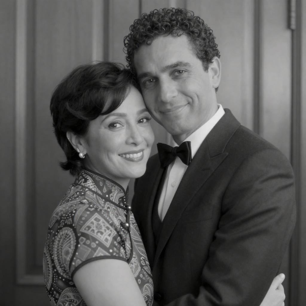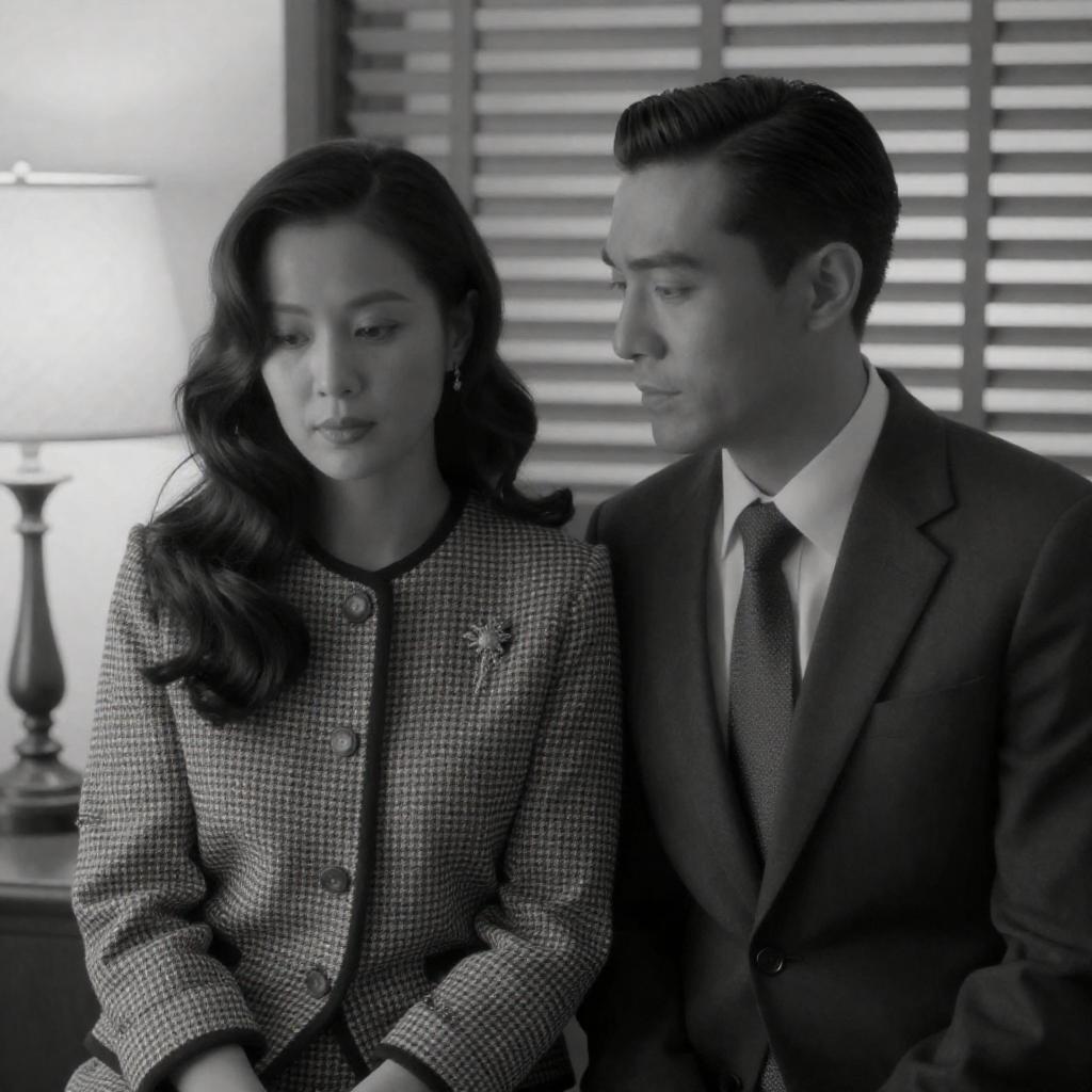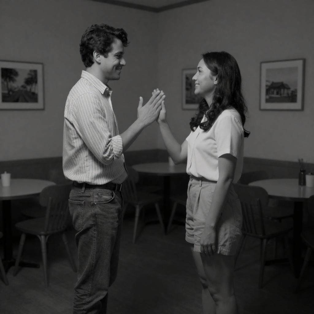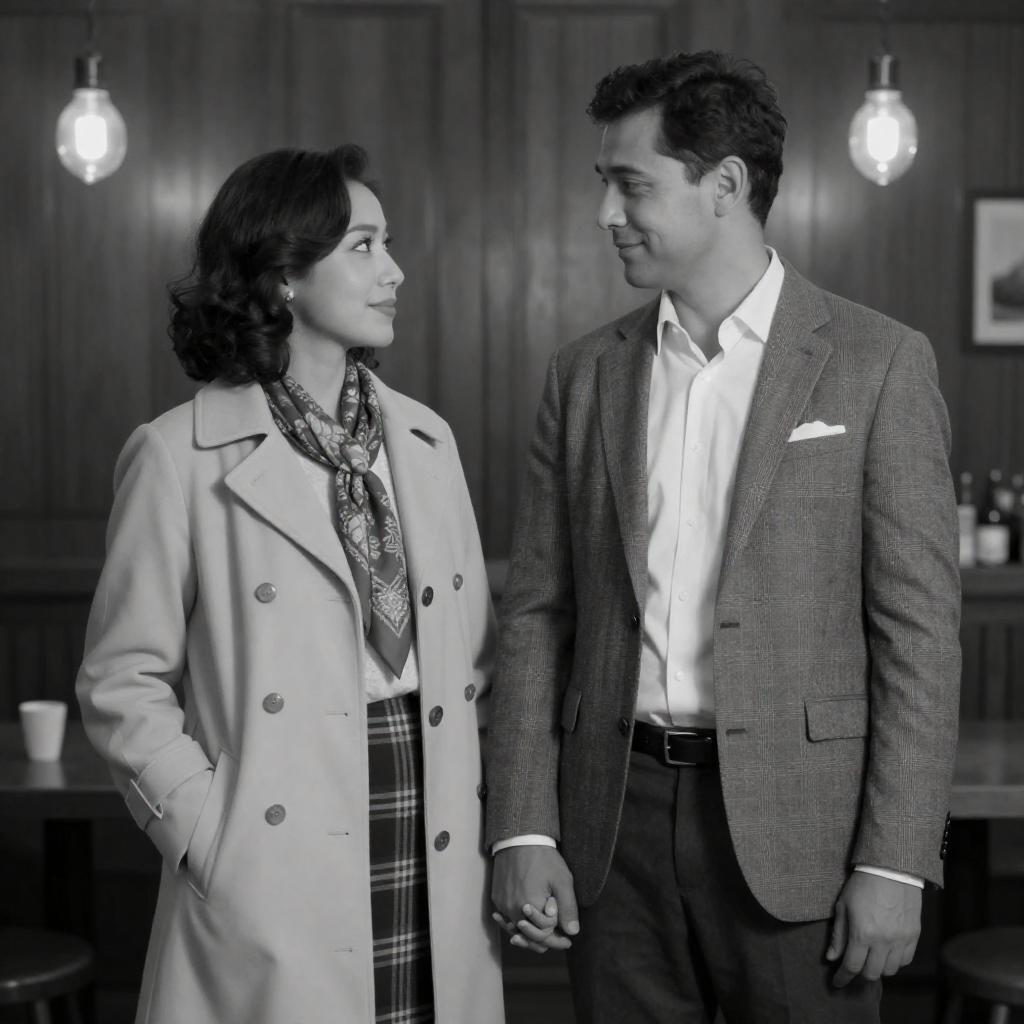Black-and-white photograph of a man and woman standing indoors. Man wears checkered suit, white shirt, dark pants. Woman wears light coat, patterned scarf, plaid skirt. Both look at each other, man holding hands together, woman clasping hands. Background has wood-paneled walls and hanging light fixtures.