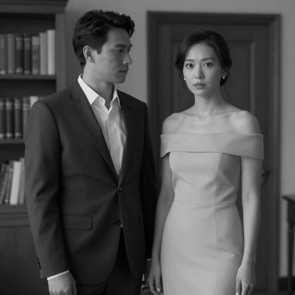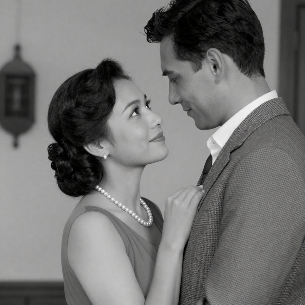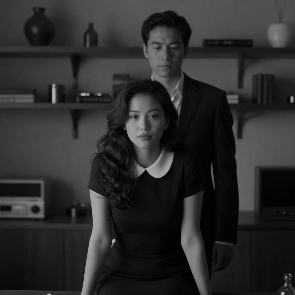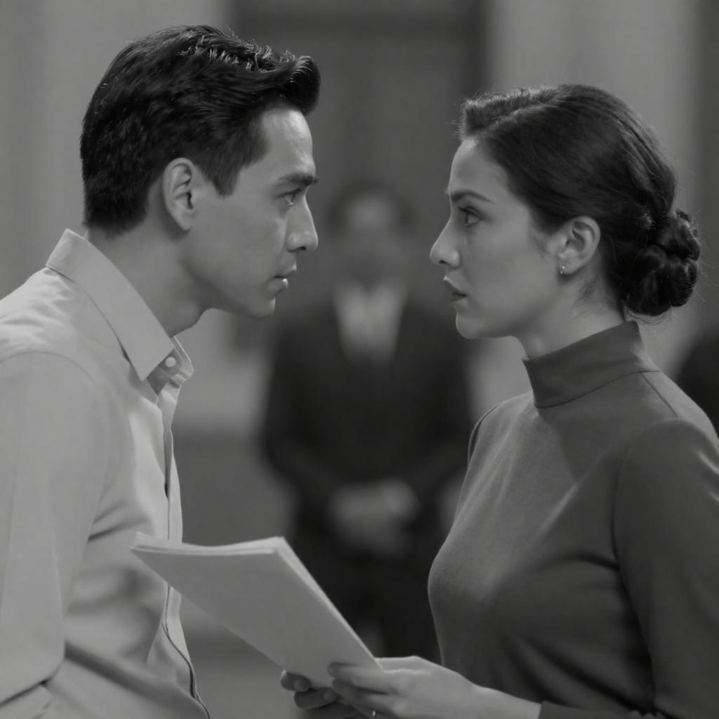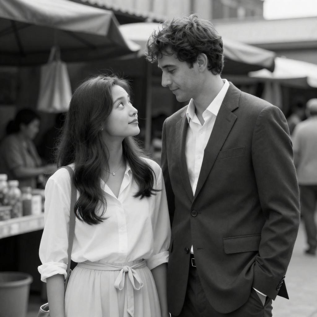 Black-and-white photograph of a man and woman standing indoors. Man wears checkered suit, white shirt, dark pants. Woman wears light coat, patterned scarf, plaid skirt. Both look at each other, man holding hands together, woman clasping hands. Background has wood-paneled walls and hanging light fixtures.