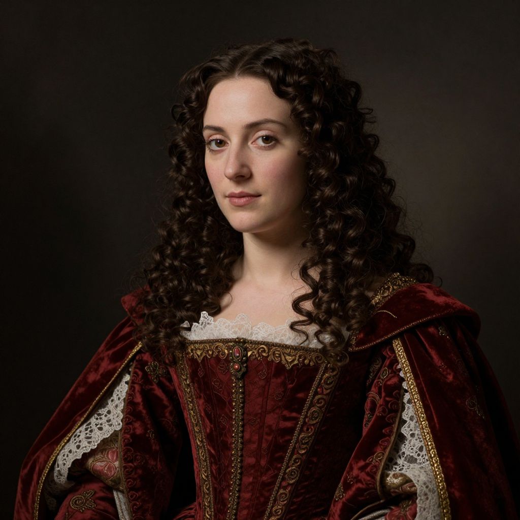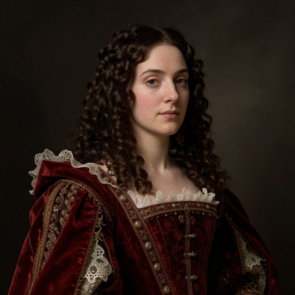 A digitally rendered portrait reminiscent of Gustave Courbet's style, featuring a woman with voluminous dark curls, dressed in a richly detailed Renaissance-inspired outfit with a deep red cloak and intricate lace trim, set against a moody, atmospheric background with dramatic lighting that highlights her serene expression and elegant attire.