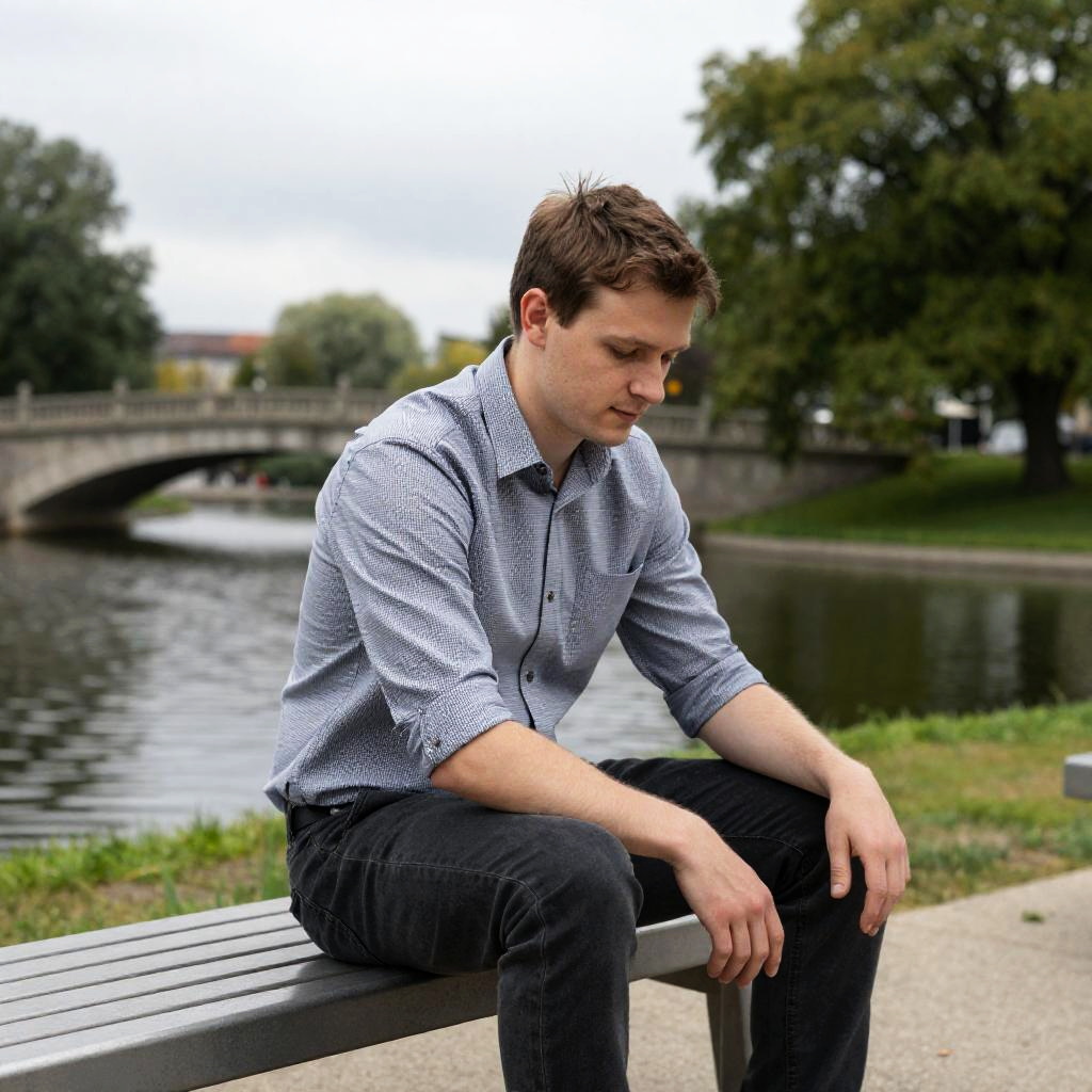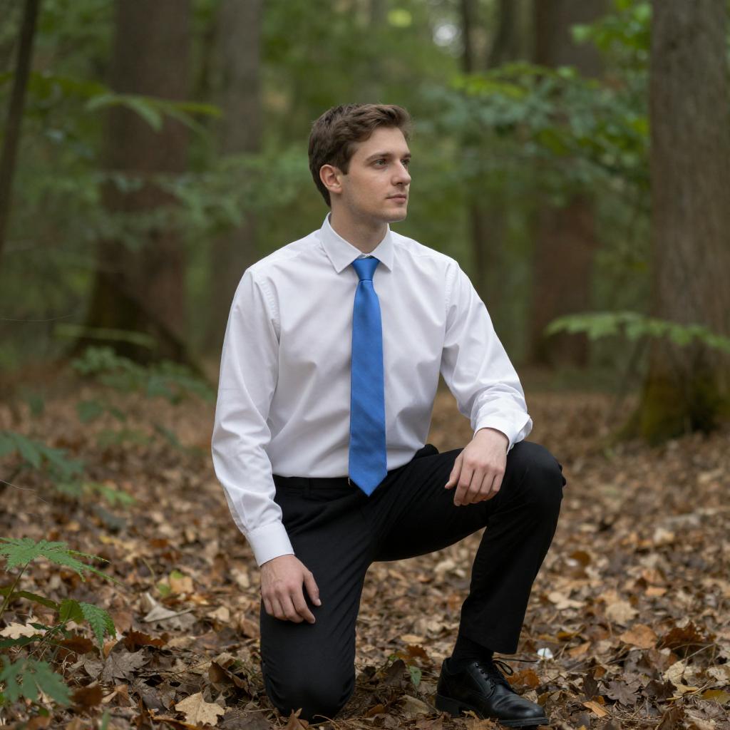 A chubby man with short brown hair, wearing a green button-up shirt, raises his right hand in a forest. Background shows a blurred person in red shorts and a tree canopy. Green foliage surrounds them.