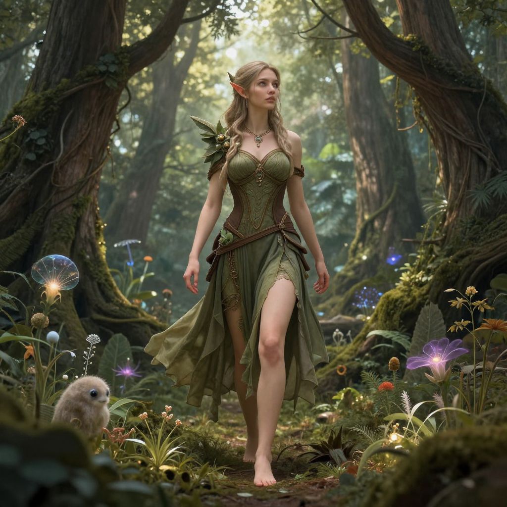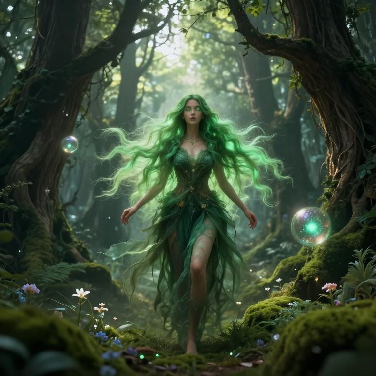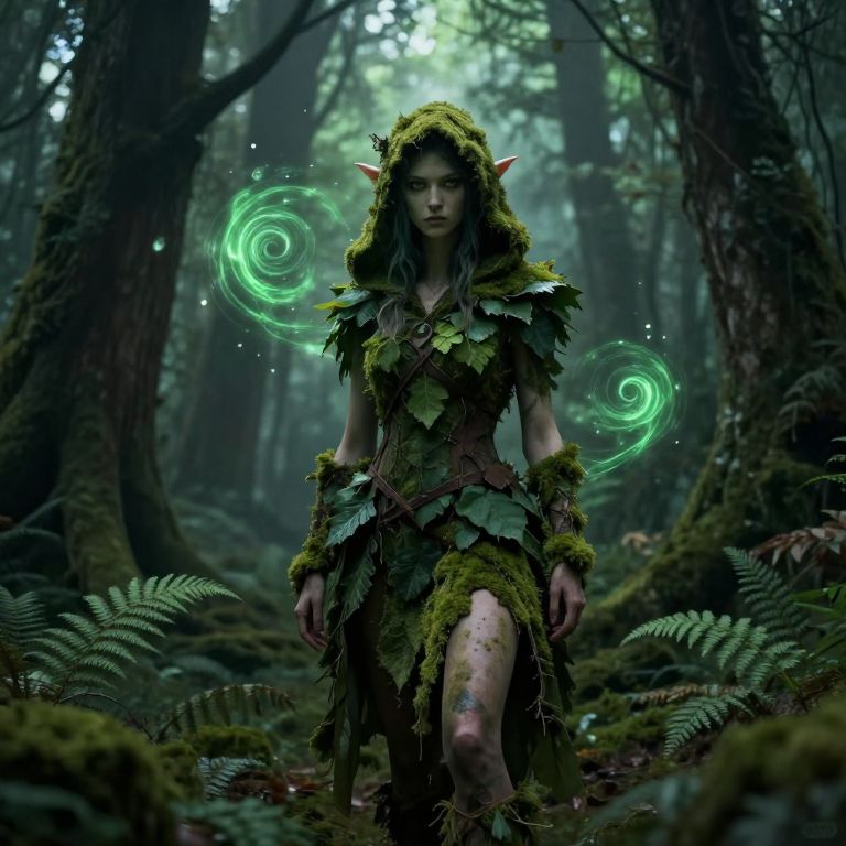 A digital fantasy artwork shows a mysterious, elf-like figure standing in a dark, misty forest. The person is dressed in a moss-covered, leafy outfit with a hood, and their eyes are serious. Green glowing spirals float around them, adding a magical vibe. The forest is dense with tall trees and ferns, creating a mystical, enchanted atmosphere.