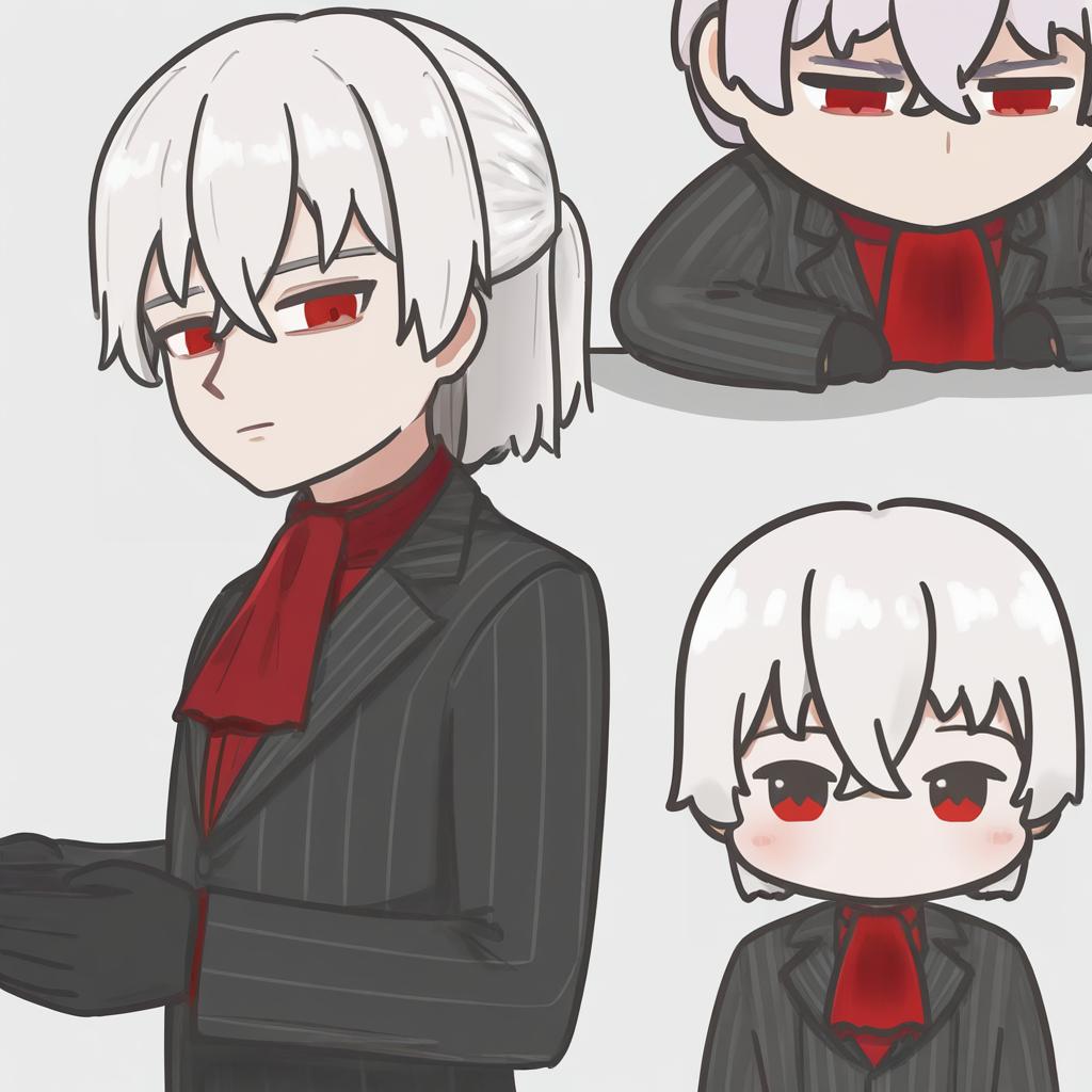 Antonio salieri (second ascension) (fate), fate/grand order, 1boy, red eyes, hair between eyes, grey hair, white hair, short hair, pinstripe suit, suit, black gloves, pinstripe suit, suit, black jacket, long sleeves, formal, half updo, formal, red ascot, by artist mpien, leet