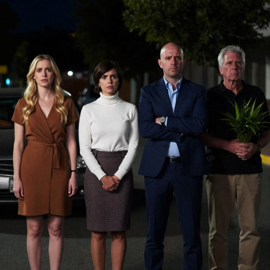 Photograph of five people standing in front of a yellow truck at night. Five individuals: blond man in green shirt, long-haired woman in white top and pink pants, bald man in black shirt, dark-haired man in white jacket, and black man in white shirt. Truck bed in background, green foliage and streetlights in background. Intense expressions. Group standing in a line, truck centered.