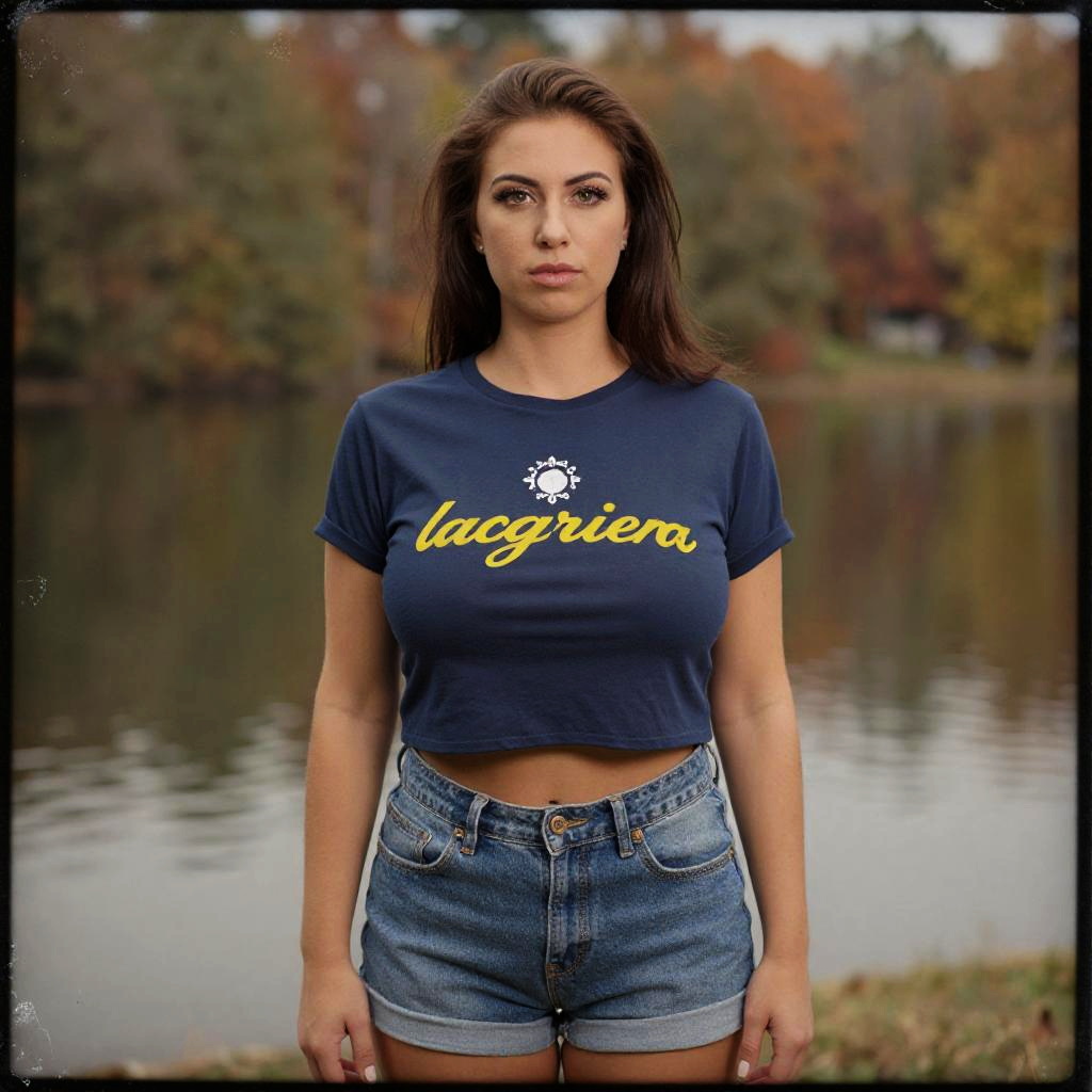 Photograph of a young woman with light olive skin and long, dark brown hair standing in front of a blurred lake with autumn-colored trees. She has a serious expression, dark, well-defined eyebrows, and is wearing a navy blue crop top with "lacyjen" in yellow cursive and a white sun graphic. She pairs this with high-waisted, blue denim shorts that accentuate her hourglass figure. The background shows a calm lake reflecting the trees, adding a natural, serene element to the image. The photo has a slight vignette effect and a soft-focus finish.