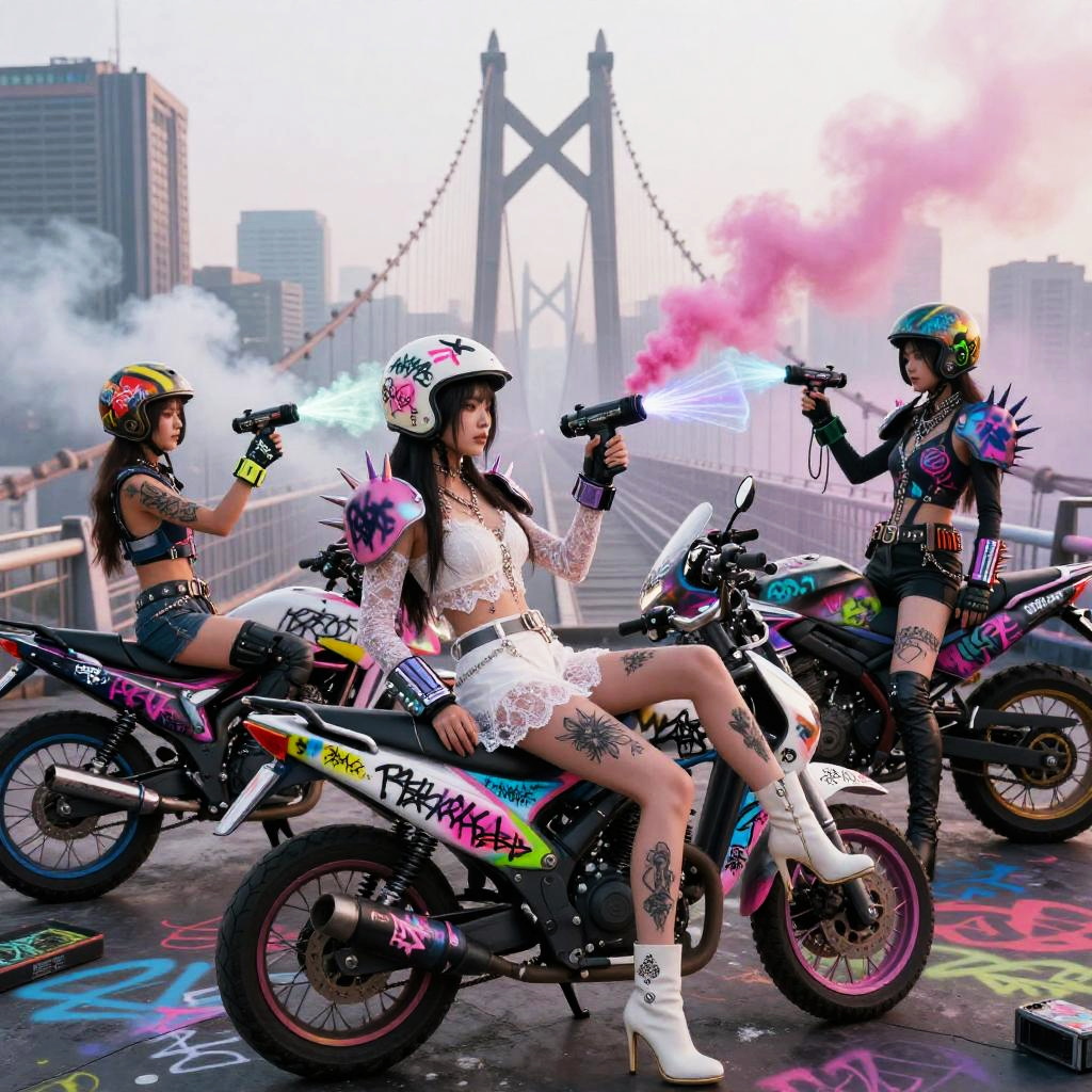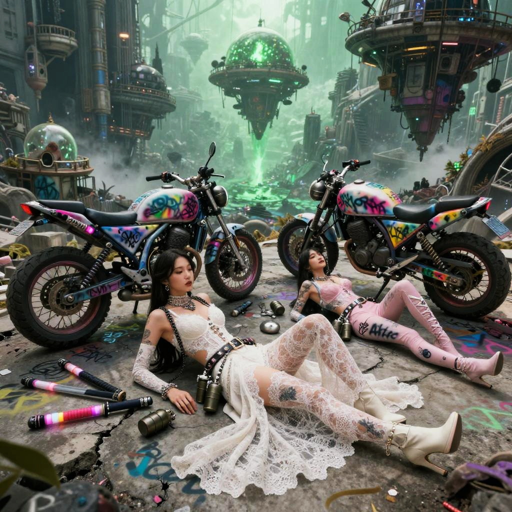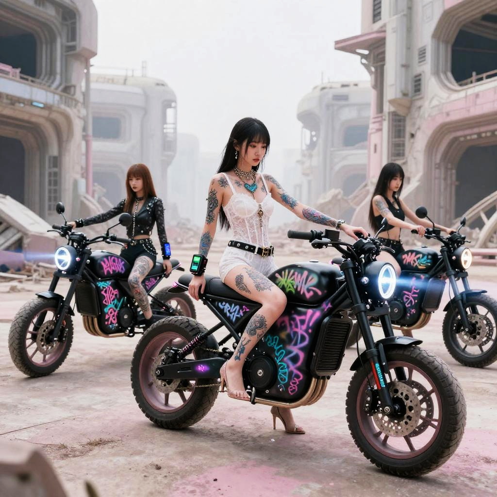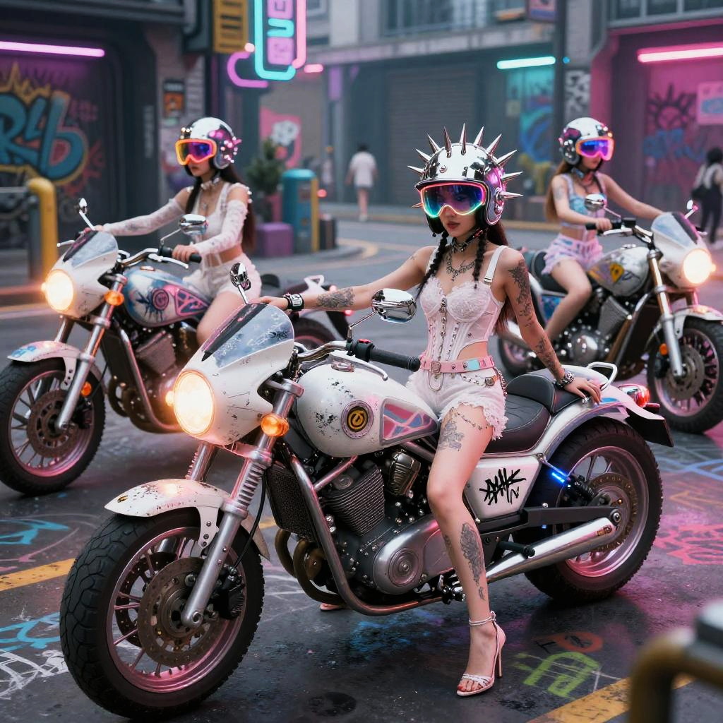 Ui/Ux Design wide angle shot of asian girl motorbike gang relaxing by their neon-lit, streamlined hoverbikes with graffiti lightning motifs, cybernetic gauntlets, layered tactical armor pieces in Haute Couture fantasy fashion shoot in a space station hangar, spraypainted bikes, graffiti, cyberpunk, dystopian, in sheer lace, graffiti, tattoos, body pierce, belt, bodice, harness, leather, guns, harness, high heels, photographed by tim walker, photorealistic, whole body, intricate 8k, pastel, pink, white, photorealistic, whole body, intricate 8k, ultra detailed, realistic, soft lighting, intricate details, beautifully color graded, Unreal Engine, Cinematic , Color Grading, Photography, Photoshoot, Shot on 85mm lens, f1.2, Depth of Field, DOF, 32k, Super-Resolution, Megapixel, Backlight, shadow Lighting, Incandescent, Optical Fiber, Studio Lighting, Soft Lighting, Volumetric, Contre-jour, neon Lighting, Accent Lighting, Global Illumination, Screen Space Global Illumination, Ray Tracing Global Illumination, Optics, Scattering, Glowing, Shadows, Rough, Shimmering, Ray Tracing Reflections, Lumen Reflections, Screen Space Reflections, Diffraction Grading, Chromatic Aberration, GB Displacement, Scan Lines, Ray Tracing Ambient Occlusion, Anti-Aliasing, FKAA, TXAA, RTX, SSAO, Shaders, OpenGL-Shaders, GLSL-Shaders, Post Processing, Post-Production, Cell Shading, Tone Mapping, CGI, VFX, SFX, insanely detailed and intricate , hyper maximalist , elegant, hyper realistic, super detailed, dynamic pose, photography, Hyper realistic, volumetric, photorealistic, ultra photoreal, ultra-detailed, intricate details, 8K, super detailed, full color, ambient occlusion, volumetric lighting , high contrast , HDR,