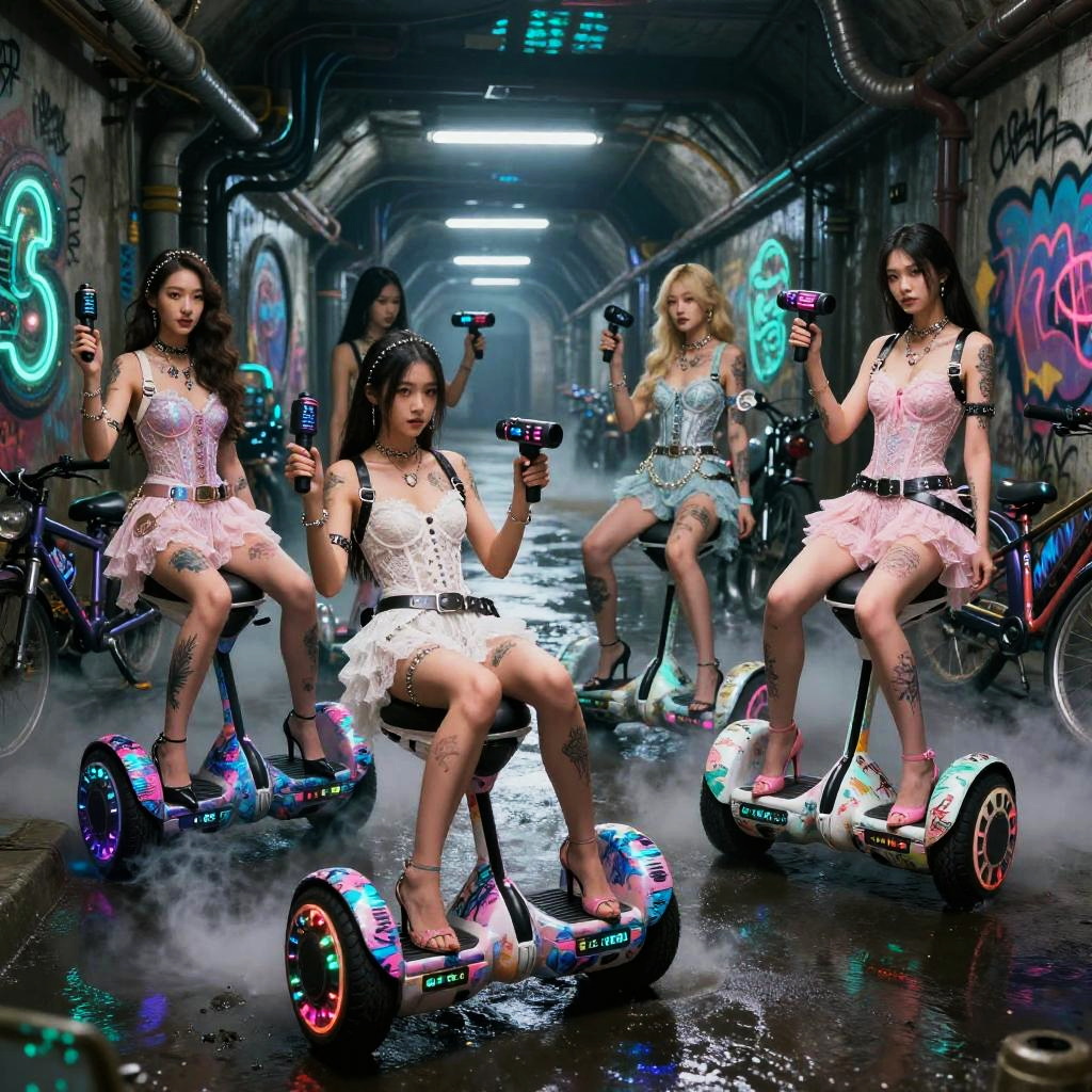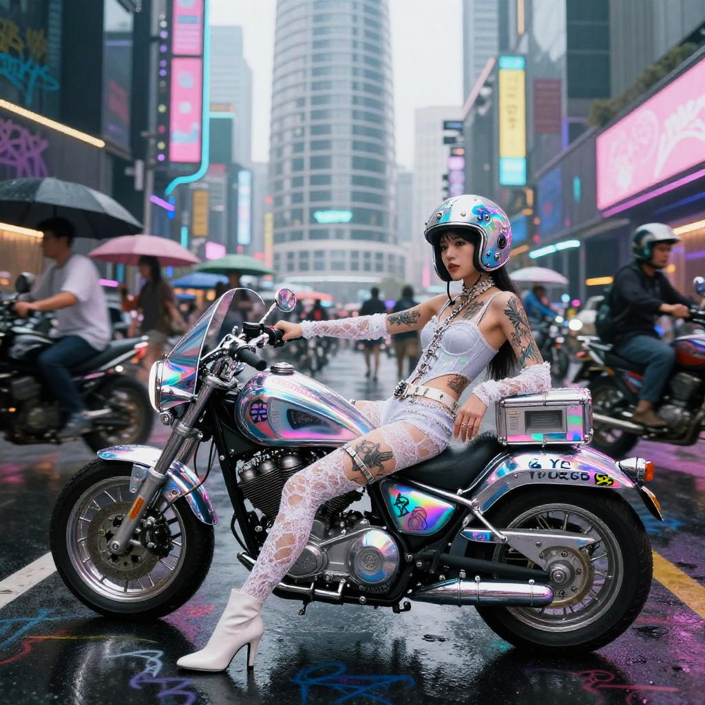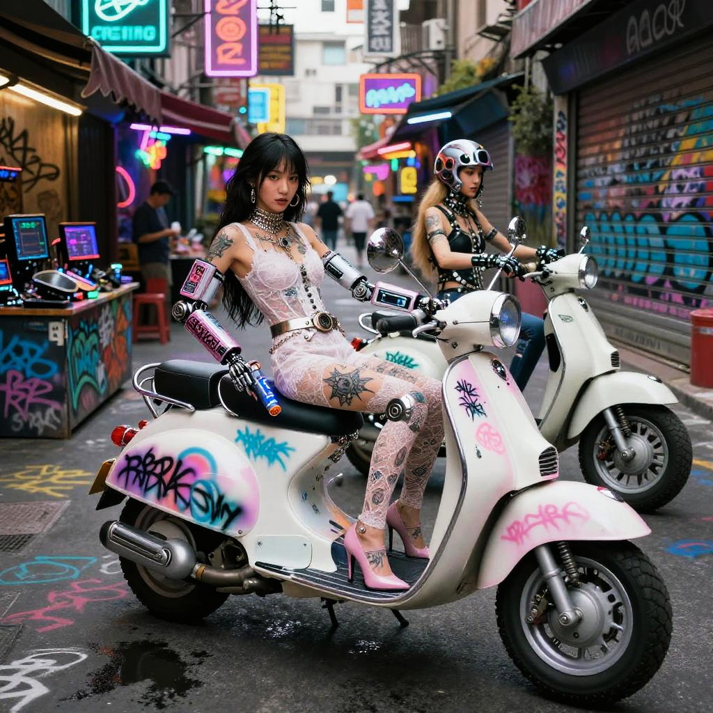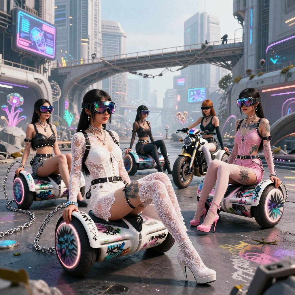 Ui/Ux Design wide angle shot of asian girl motorbike gang relaxing by their neon-lit, streamlined hoverbikes with graffiti lightning motifs, cybernetic gauntlets, layered tactical armor pieces in Haute Couture fantasy fashion shoot in a space station hangar, spraypainted bikes, graffiti, cyberpunk, dystopian, in sheer lace, graffiti, tattoos, body pierce, belt, bodice, harness, leather, guns, harness, high heels, photographed by tim walker, photorealistic, whole body, intricate 8k, pastel, pink, white, photorealistic, whole body, intricate 8k, ultra detailed, realistic, soft lighting, intricate details, beautifully color graded, Unreal Engine, Cinematic , Color Grading, Photography, Photoshoot, Shot on 85mm lens, f1.2, Depth of Field, DOF, 32k, Super-Resolution, Megapixel, Backlight, shadow Lighting, Incandescent, Optical Fiber, Studio Lighting, Soft Lighting, Volumetric, Contre-jour, neon Lighting, Accent Lighting, Global Illumination, Screen Space Global Illumination, Ray Tracing Global Illumination, Optics, Scattering, Glowing, Shadows, Rough, Shimmering, Ray Tracing Reflections, Lumen Reflections, Screen Space Reflections, Diffraction Grading, Chromatic Aberration, GB Displacement, Scan Lines, Ray Tracing Ambient Occlusion, Anti-Aliasing, FKAA, TXAA, RTX, SSAO, Shaders, OpenGL-Shaders, GLSL-Shaders, Post Processing, Post-Production, Cell Shading, Tone Mapping, CGI, VFX, SFX, insanely detailed and intricate , hyper maximalist , elegant, hyper realistic, super detailed, dynamic pose, photography, Hyper realistic, volumetric, photorealistic, ultra photoreal, ultra-detailed, intricate details, 8K, super detailed, full color, ambient occlusion, volumetric lighting , high contrast , HDR,