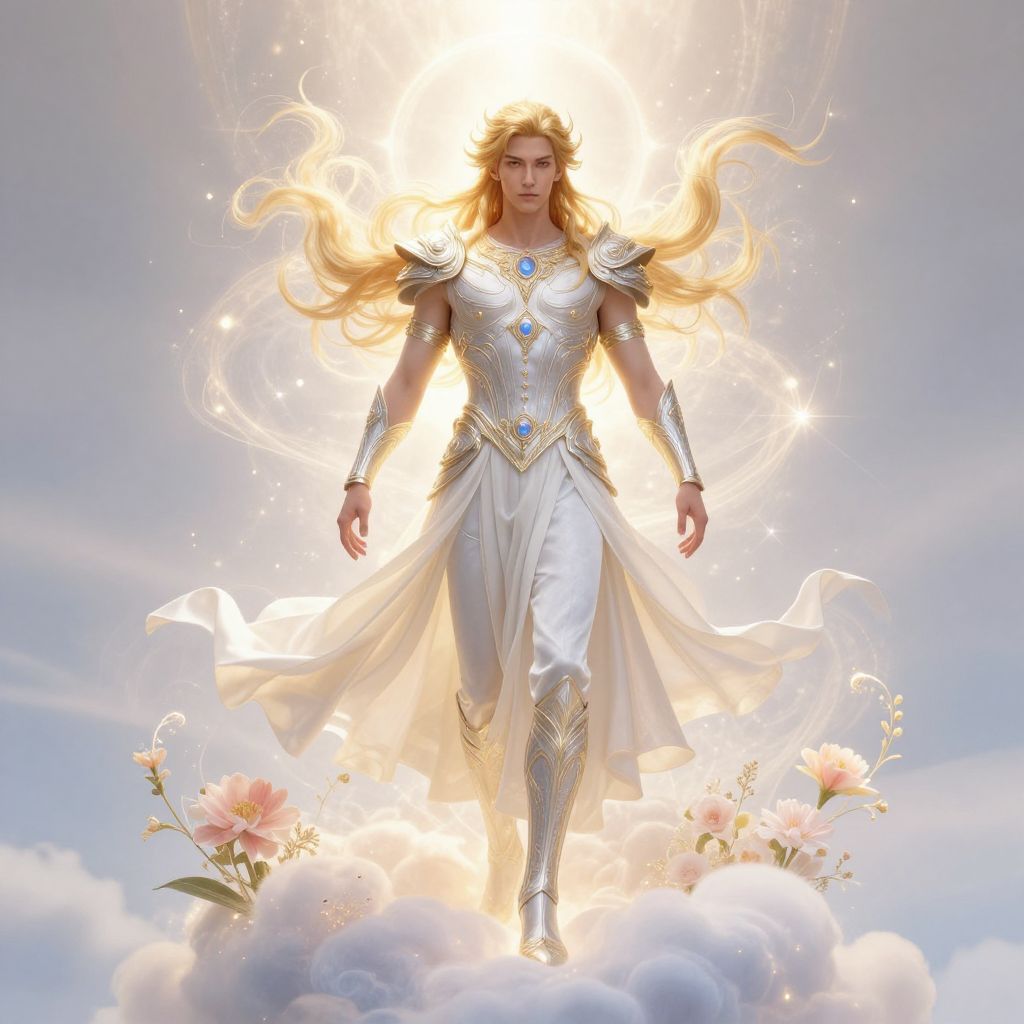 Digital fantasy artwork of a muscular, dark-haired man with a strong jawline, standing waist-deep in turbulent ocean waves. He wears an elaborate, metallic blue and silver armor adorned with pearl necklaces and white, flower-like shoulder plates. His long, flowing hair is windswept, and his intense gaze is directed forward. The stormy, cloud-filled sky contrasts with the bright, splashing waves. The overall mood is powerful and epic, with a mix of mythological and heroic elements. The man's physique and detailed armor suggest a warrior or sea deity.