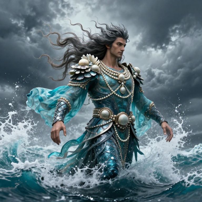Digital art: Muscular, dark-haired man with flowing hair, wearing ornate blue armor and pearls, standing in turbulent ocean waves under stormy sky