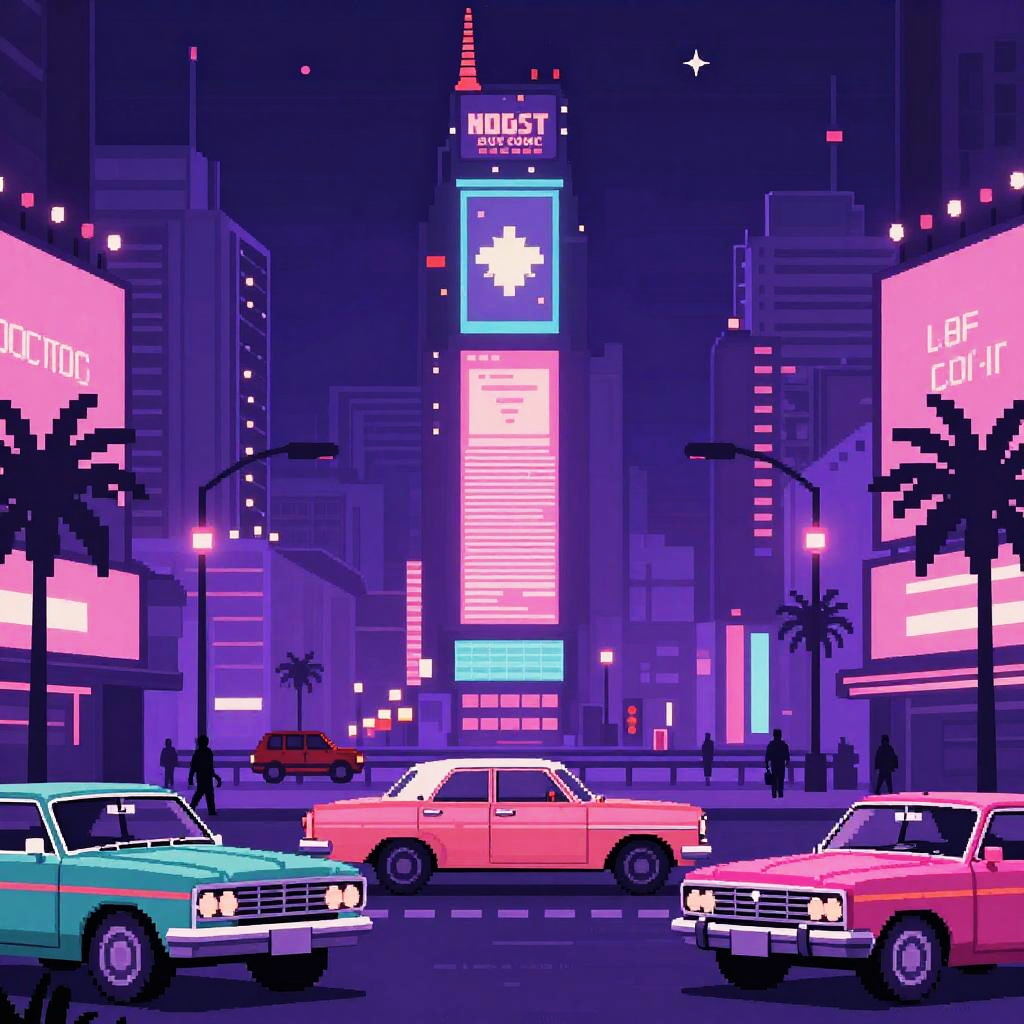 Retro city background featuring vintage cars and glowing billboards, purple and pink hues, 1980s urban vibe, pixel art style, bustling streets with silhouettes of pedestrians
