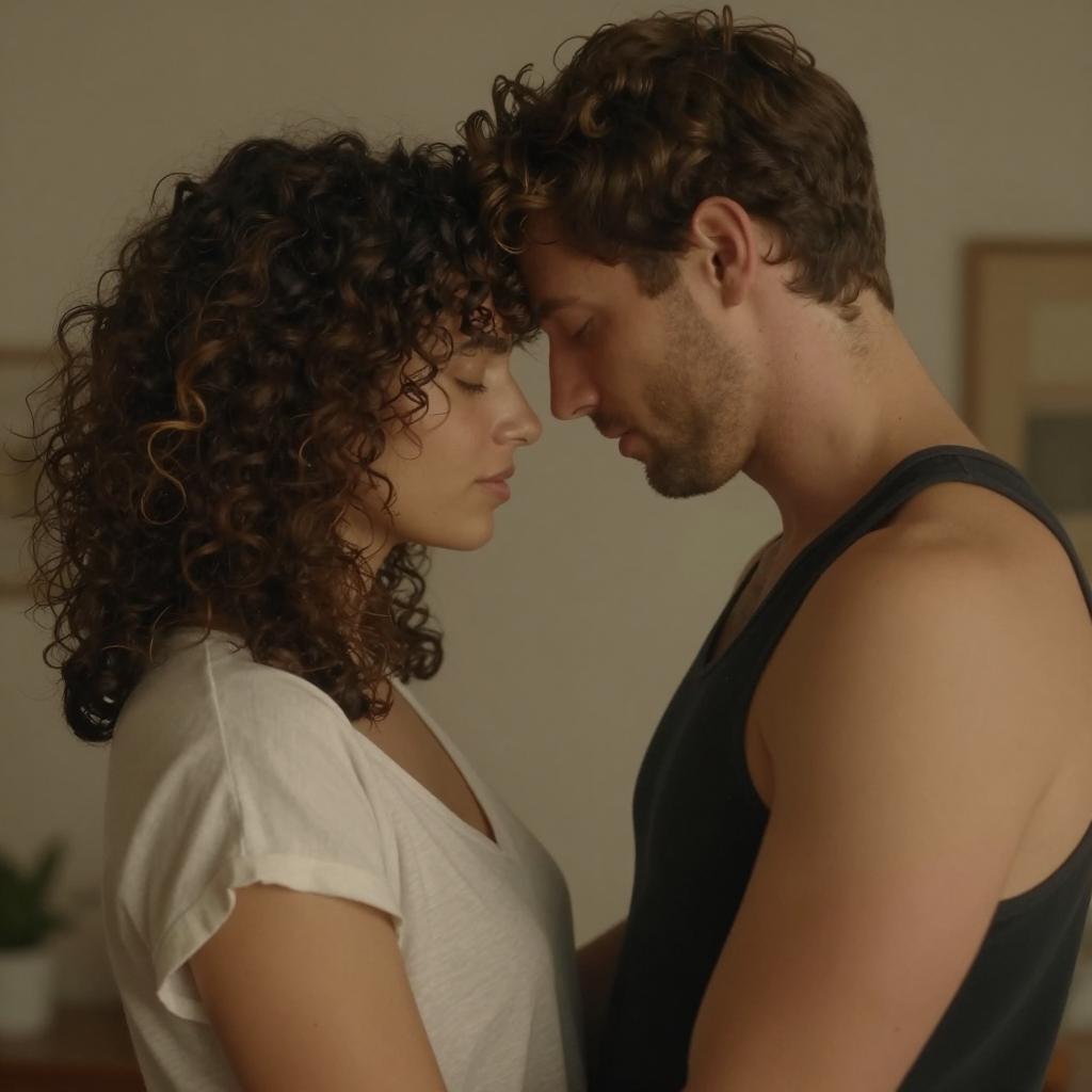 Couple embracing outdoors. Woman with brown hair in braid, white sleeveless knit top, eyes closed, arms around man's neck. Man with short brown hair, brown shirt, eyes closed, arms around woman. Green leafy background. Woman's right hand on man's back. Man's left hand on woman's waist. Foreheads touching. Intimate, close-up shot.
