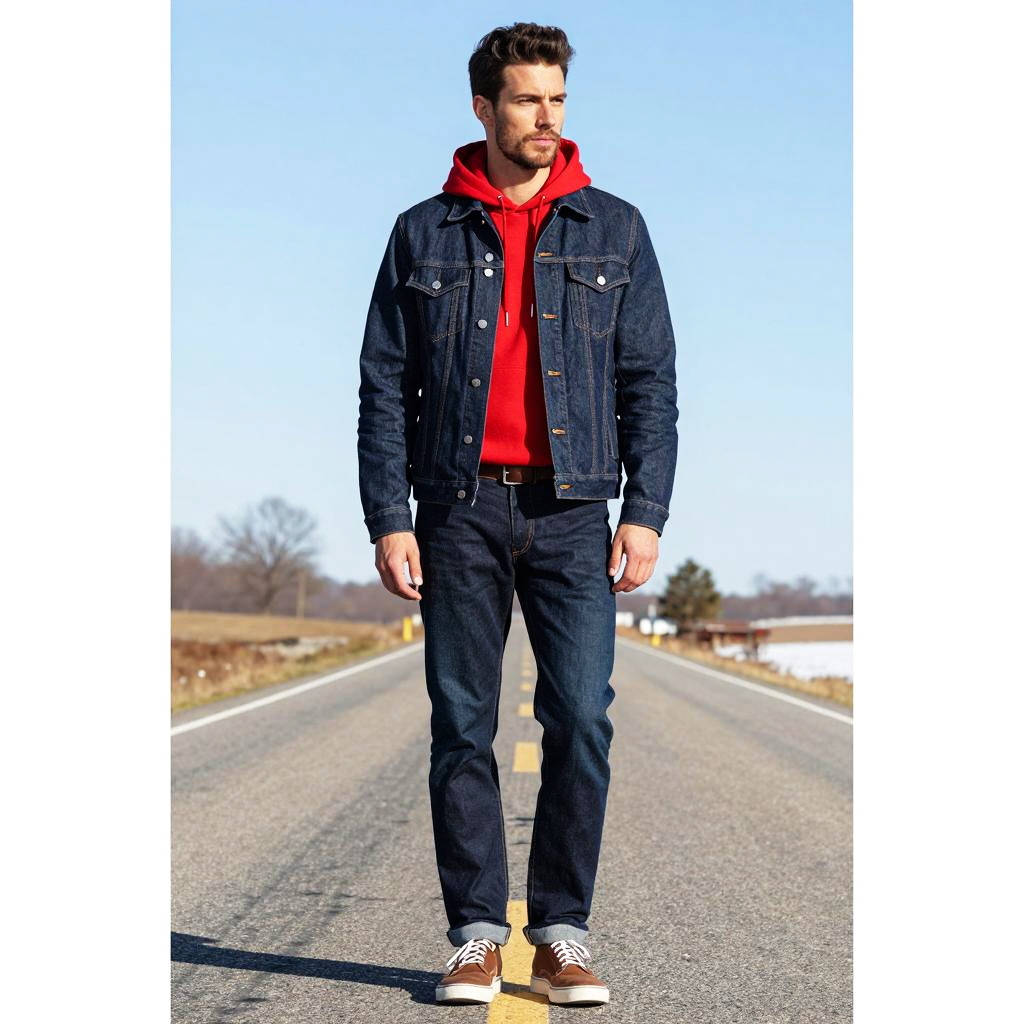Man, casual style, navy blue denim jacket with a red hoodie underneath, dark blue jeans, brown belt, casual lace-up shoes, styled hair, on a country road background with blue skies and a hint of snow on the ground.