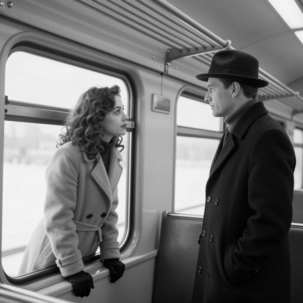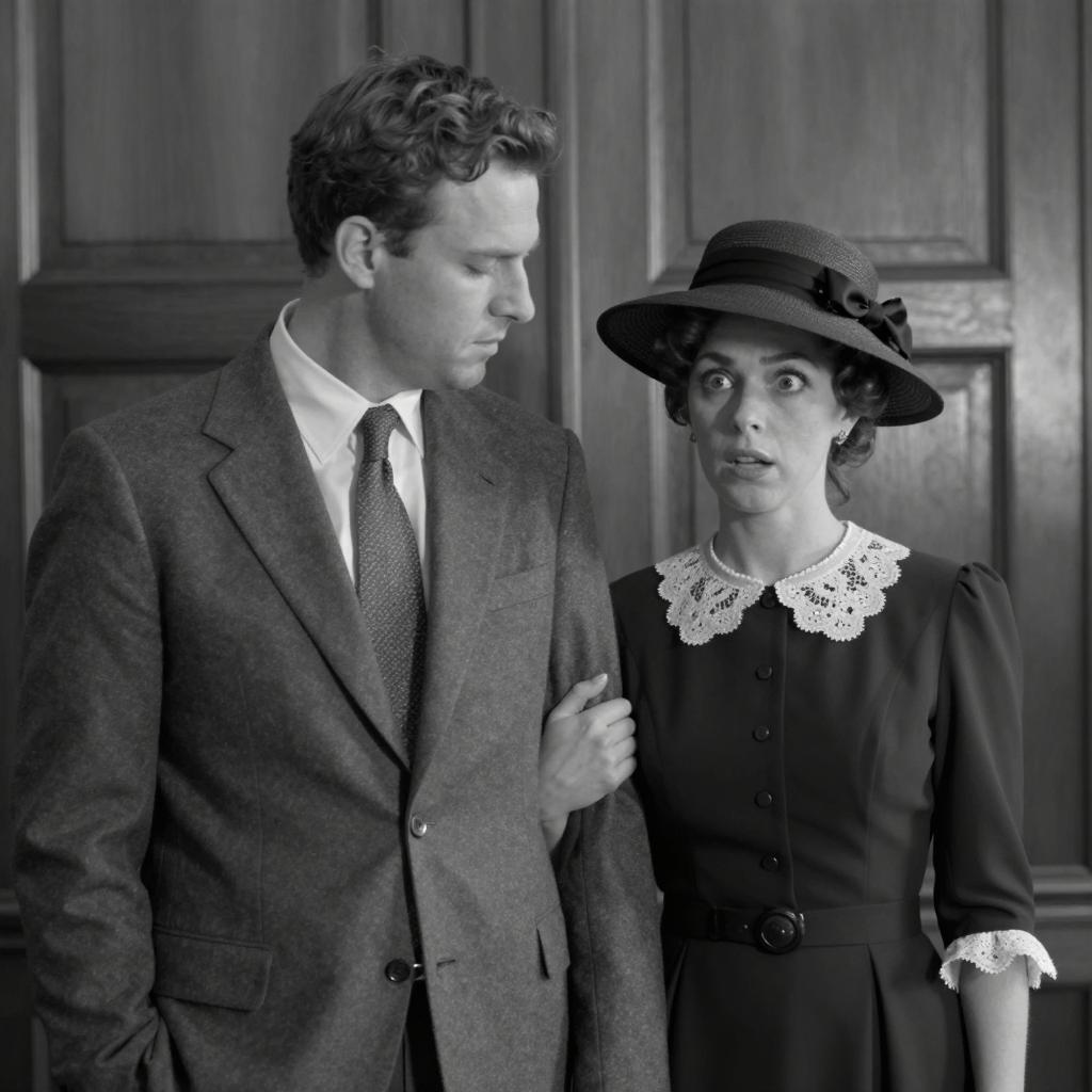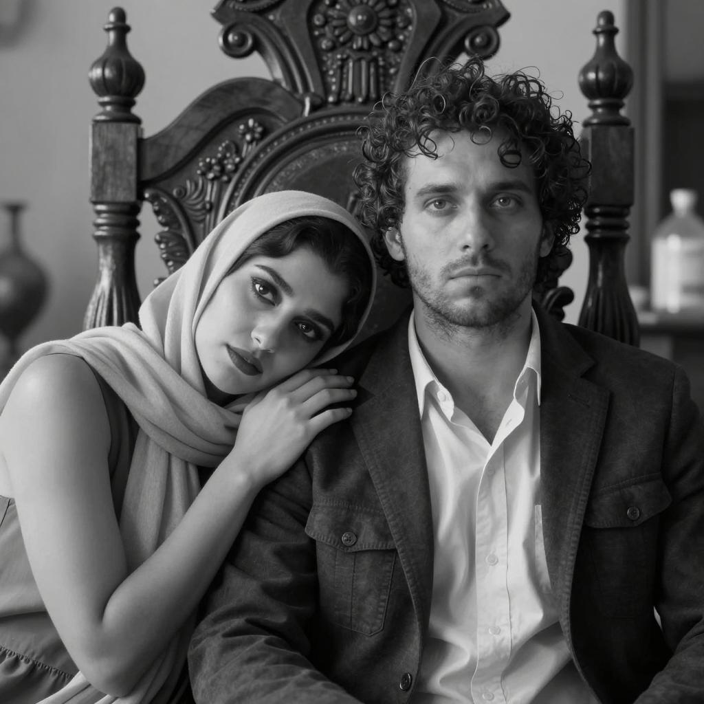 Black-and-white photograph. Man and woman sitting at a small wooden table in a room with lace curtains. Woman in a white dress with a headscarf, man in a dark suit with a tie. Framed painting on wall. Two chairs, glasses, and a folded cloth on table. Woman's arm around man's waist. Man looking at woman with a neutral expression. Light coming through windows.