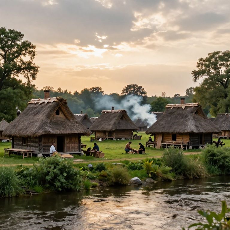 Ancient Cherusker village by the riverbank during sunset, wooden longhouses with thatched roofs, smoke gently rising from chimneys, villagers engaged in daily rituals and crafting, lush greenery surrounding settlement, serene and historically immersive setting.