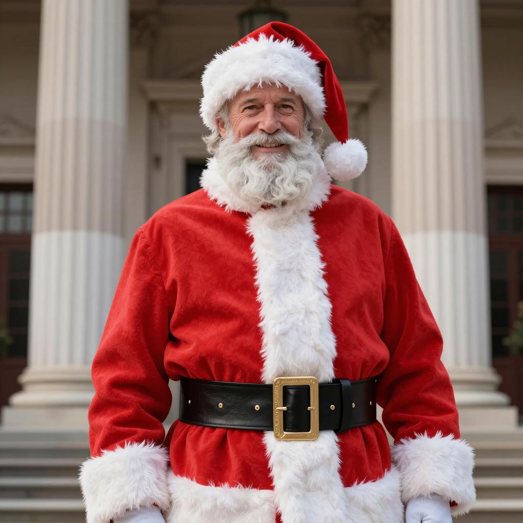 Christmas running costume, photograph of a smiling man running in a red Santa Claus outfit with white fur trim, black boots, and a Santa hat, carrying a small green Christmas wreath, sunny winter street background with blurred Christmas trees and wrapped presents, daytime, festive, holiday, outdoor, cheerful, full-body shot