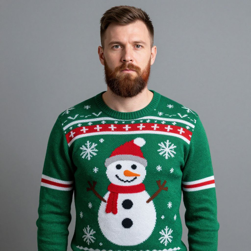 Photograph of a bearded white man with short brown hair, wearing a green Christmas sweater with a red and white snowman design and festive patterns. The background is a simple gray. The sweater has a red hat on the snowman, white snowflakes, and red and white stripes. He's looking directly at the camera with a neutral expression.
