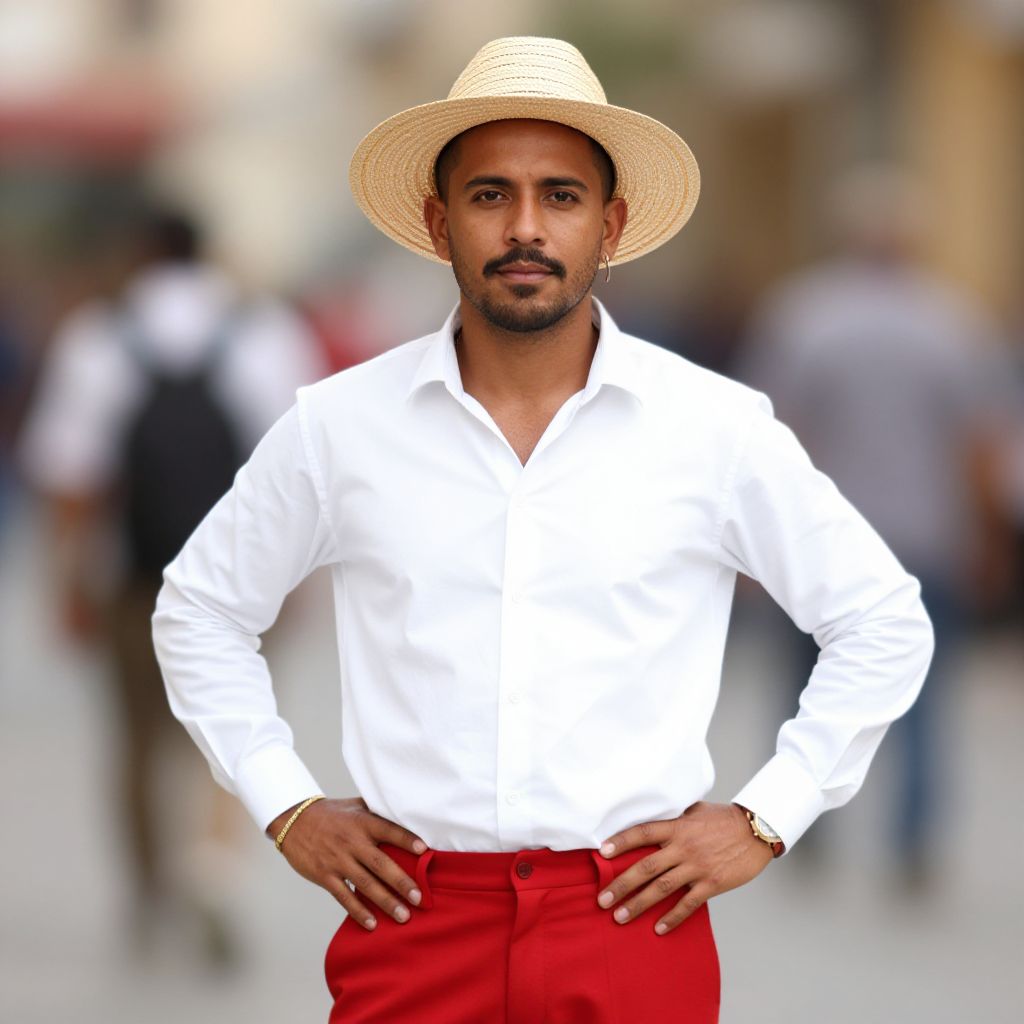 Photograph of a handsome, medium-skinned South Asian man with a trimmed beard and brown eyes, wearing a wide-brimmed straw hat, white button-up shirt, and bright red pants. He stands with hands on hips, exuding confidence. The background is blurred, showing a bustling street with indistinct people and buildings, highlighting his sharp, contrasting outfit. He accessorizes with a gold watch and ring, adding a touch of elegance. The image has a vibrant, slightly saturated color style.