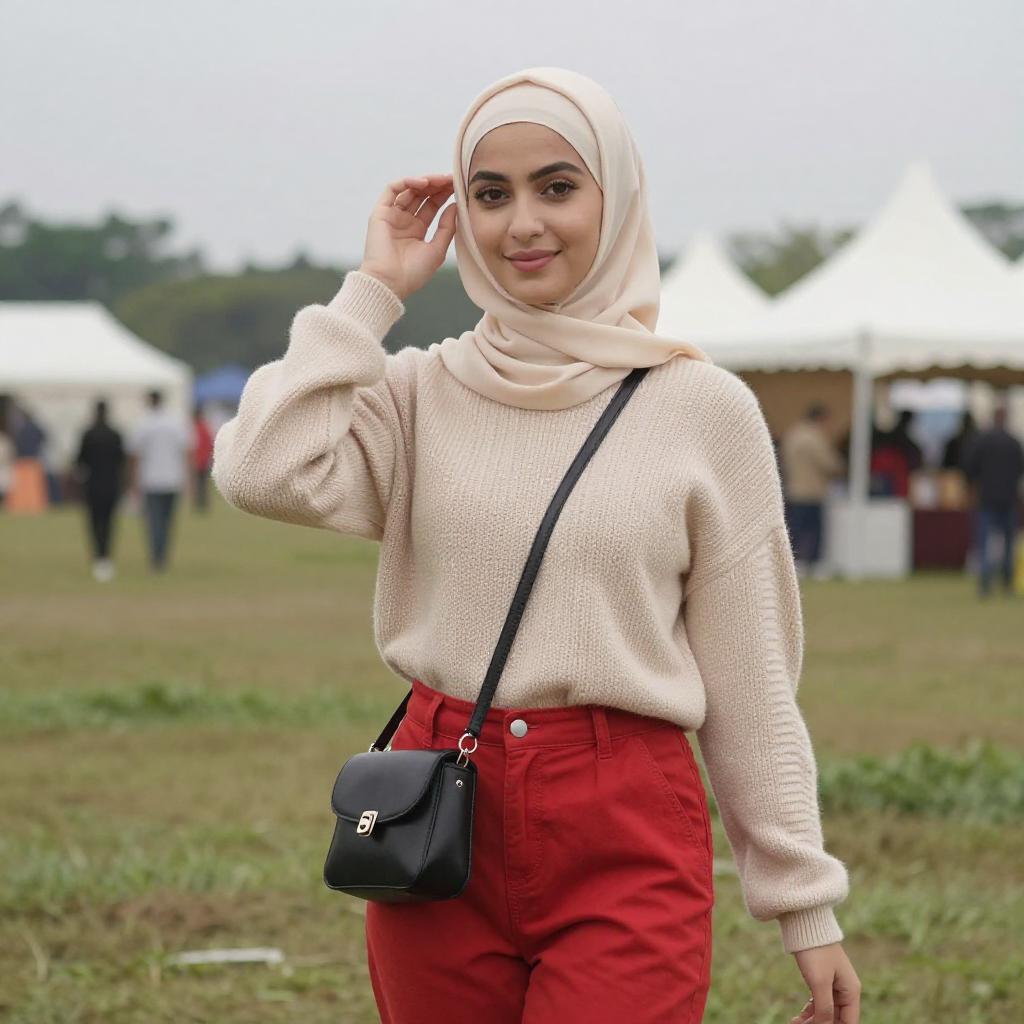Photograph of a young woman with light skin and brown eyes, wearing a beige hijab, beige knit sweater, and bright red pants. She has a small black crossbody purse and is smiling while touching her hair with her right hand. She stands on a grassy field with white tents and people in the background under a cloudy sky.