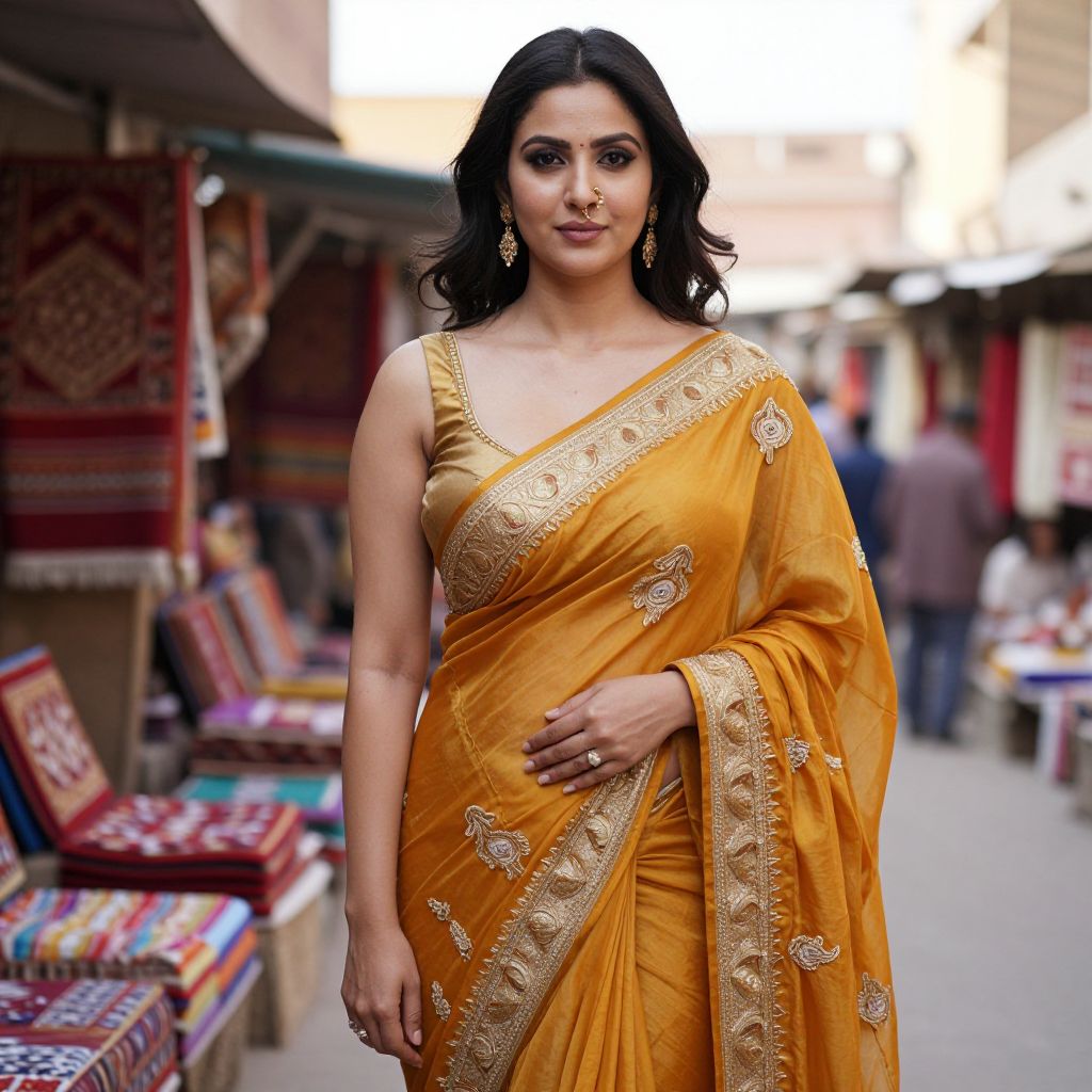 An elegant Indian saree woman with medium-long black hair, natural features, and a composed demeanor, dressed in a rich saffron and gold saree with hand-embroidered peacock designs and a subtle border, the saree neatly draped with one corner tucked at her chest and the other flowing behind her, wearing delicate earrings and an ornate nose ring, standing in a heritage market in Jaipur, surrounded by colorful textiles and traditional items under a bright afternoon sky. The woman has big tits and cute face
