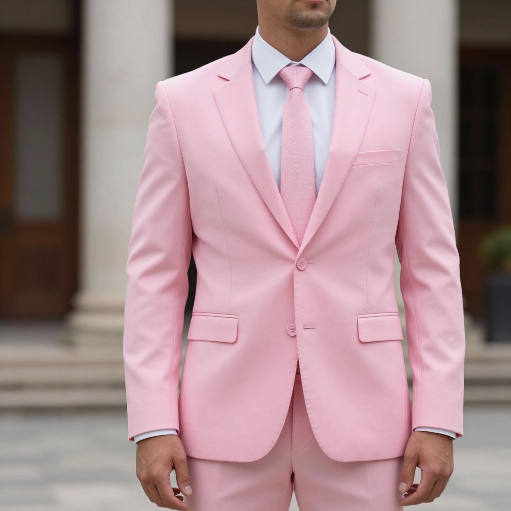 Photograph of a man from the waist up, wearing a light pink suit with a white dress shirt and matching pink tie. The suit is well-fitted, with a single button closure and two flap pockets. The background features blurred, white marble columns and steps, suggesting an outdoor urban setting. The man's face is not visible, focusing attention on the suit. The image has a bright, natural light, highlighting the soft pink color of the suit. The overall style is modern and formal.
