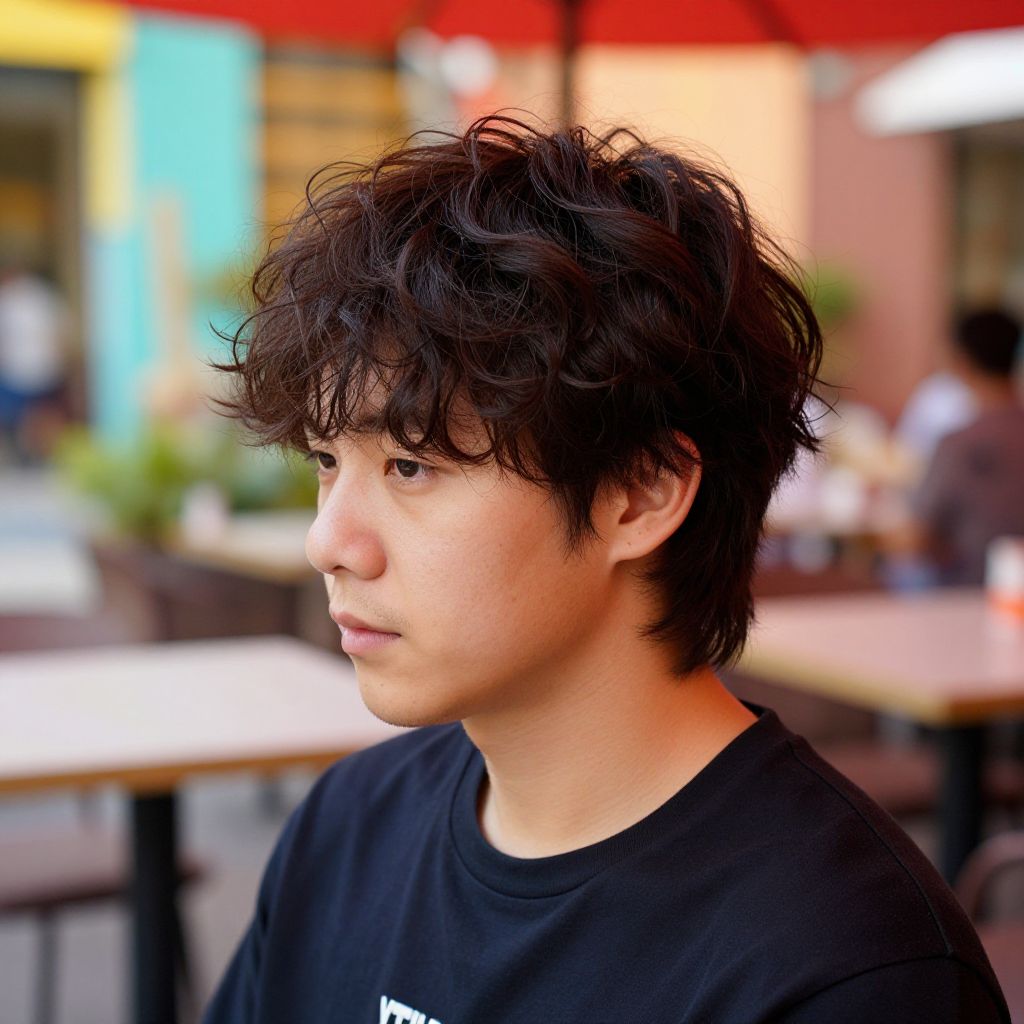 Asian men medium haircut, casual trendy style, slightly messy waves, dark brown hair, outdoor cafe setting, vibrant colors, cinematic lighting