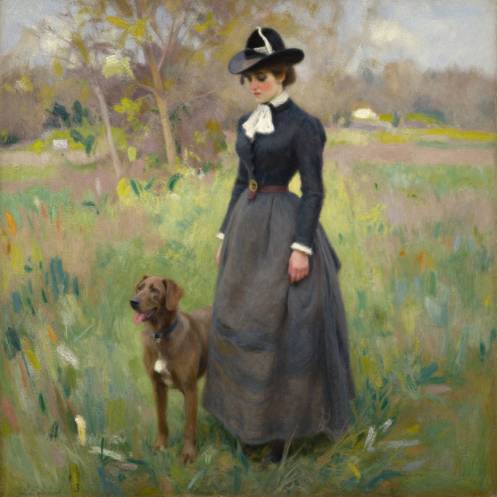 Impressionist painting of a Victorian woman in black dress and hat standing in a grassy field with a brown dog.