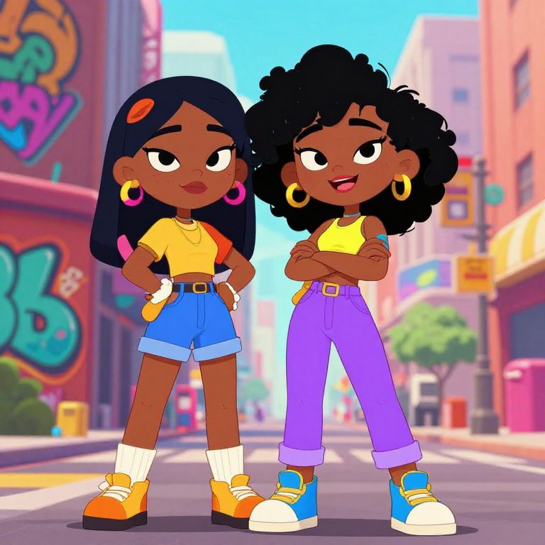 Digital cartoon of two dark-skinned girls with big eyes, standing confidently on a colorful city street, wearing yellow tops and high-waisted jeans.