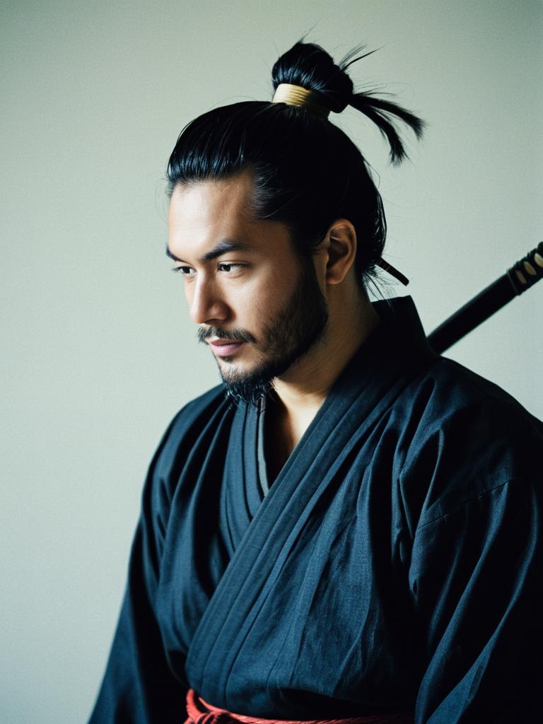 Man in Samurai Man Bun Hairstyle costume, cosplay editorial portrait, cinematic realism