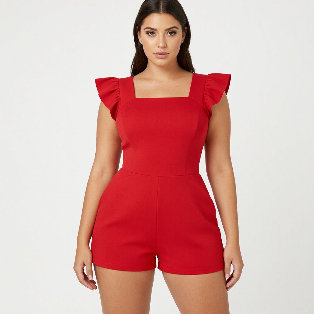 "Woman, contemporary, red romper with a fitted waist, square neckline, shoulder cut-outs with short ruffle details, straight-leg shorts, black ankle-strap heels, plain white background.. Sexy. Pretty face and beаutiful eyes. Big breasts."