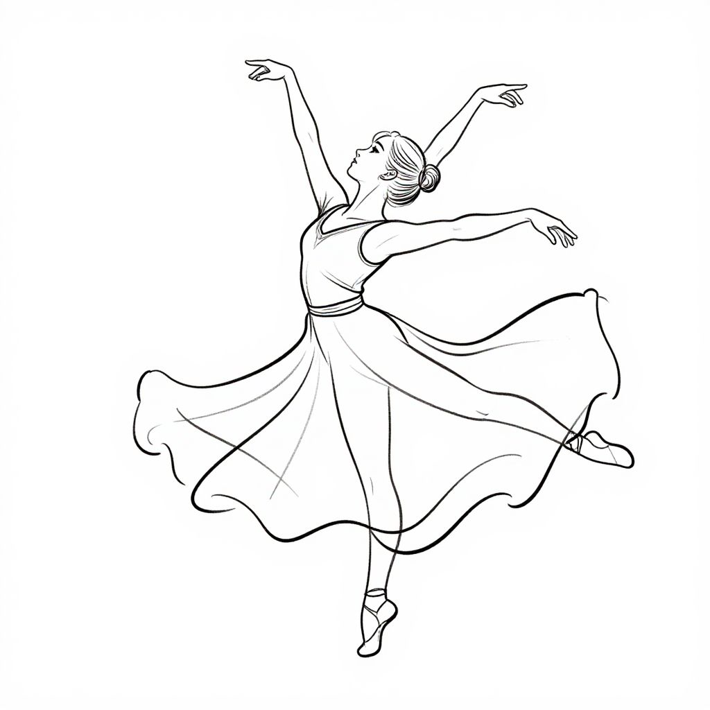 Black and white line drawing of a dancer with a flowing dress, arms raised, one leg lifted, wearing ballet shoes, dynamic pose.