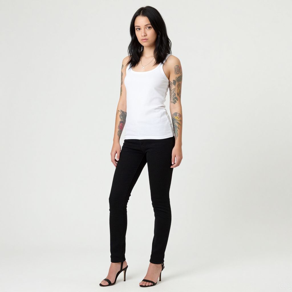 Photograph of a young woman with long black hair standing against a plain white background. She's wearing a white tank top, black skinny jeans, and black high-heeled sandals. Her arms have colorful tattoos that extend from her wrists to her upper arms. She's looking directly at the camera with a neutral expression. The image has a watermark in the bottom right corner.