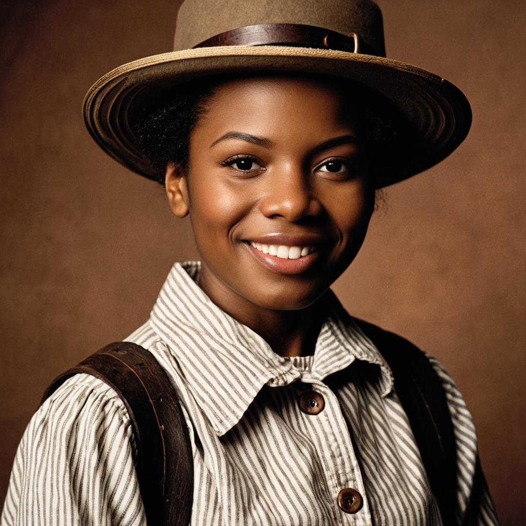 Harriet tubman,solo, 1boy, male focus, hat, looking at viewer, old, upper body, brown background, realistic, buttons, smile, shirt, belt