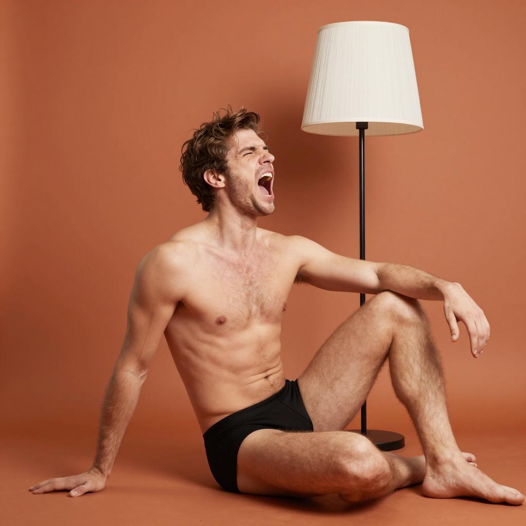 Shirtless man with short brown hair, medium build, wearing black briefs, sitting on floor, leaning against tall lamp with white shade, mouth open in mid-yell, orange ured background with abstract shapes.