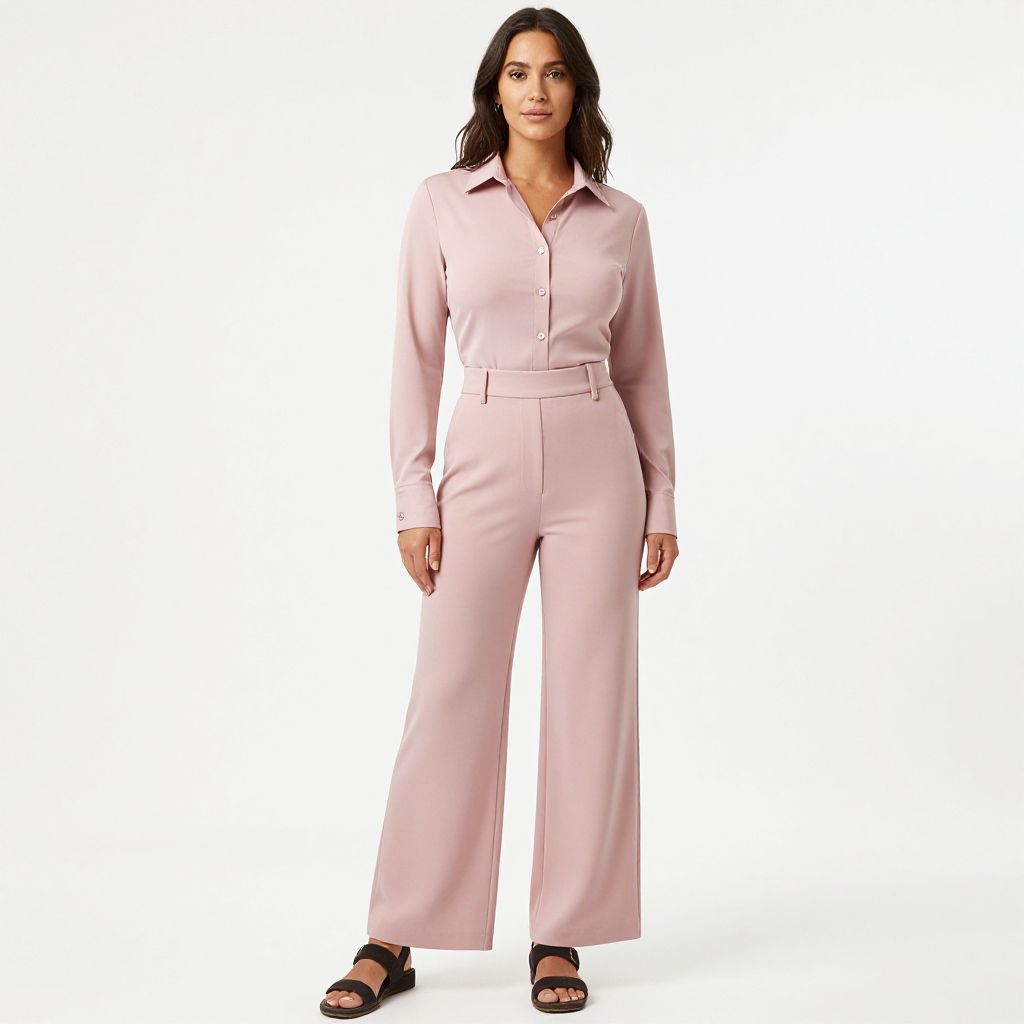 "Woman, casual chic, pastel pink two-piece ensemble, long-sleeve button-up shirt, pointed collar, fitted wrist cuffs, matching high-waisted wide-leg trousers, dark sandals with thick straps, white background.. Sexy. Pretty face and beаutiful eyes. Big breasts."